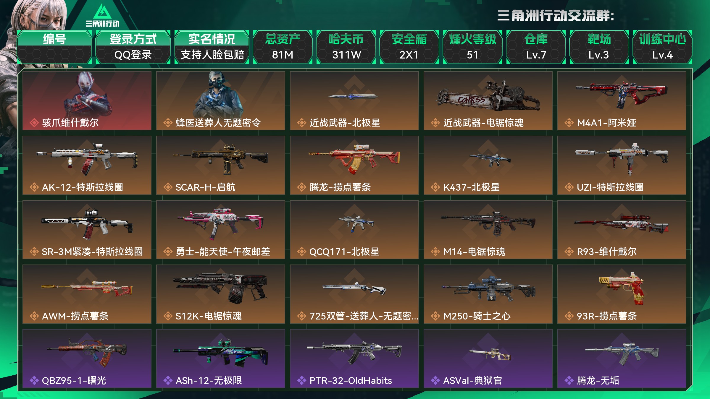 总资产:81M,哈夫币:311W,武器皮肤129;烽火5