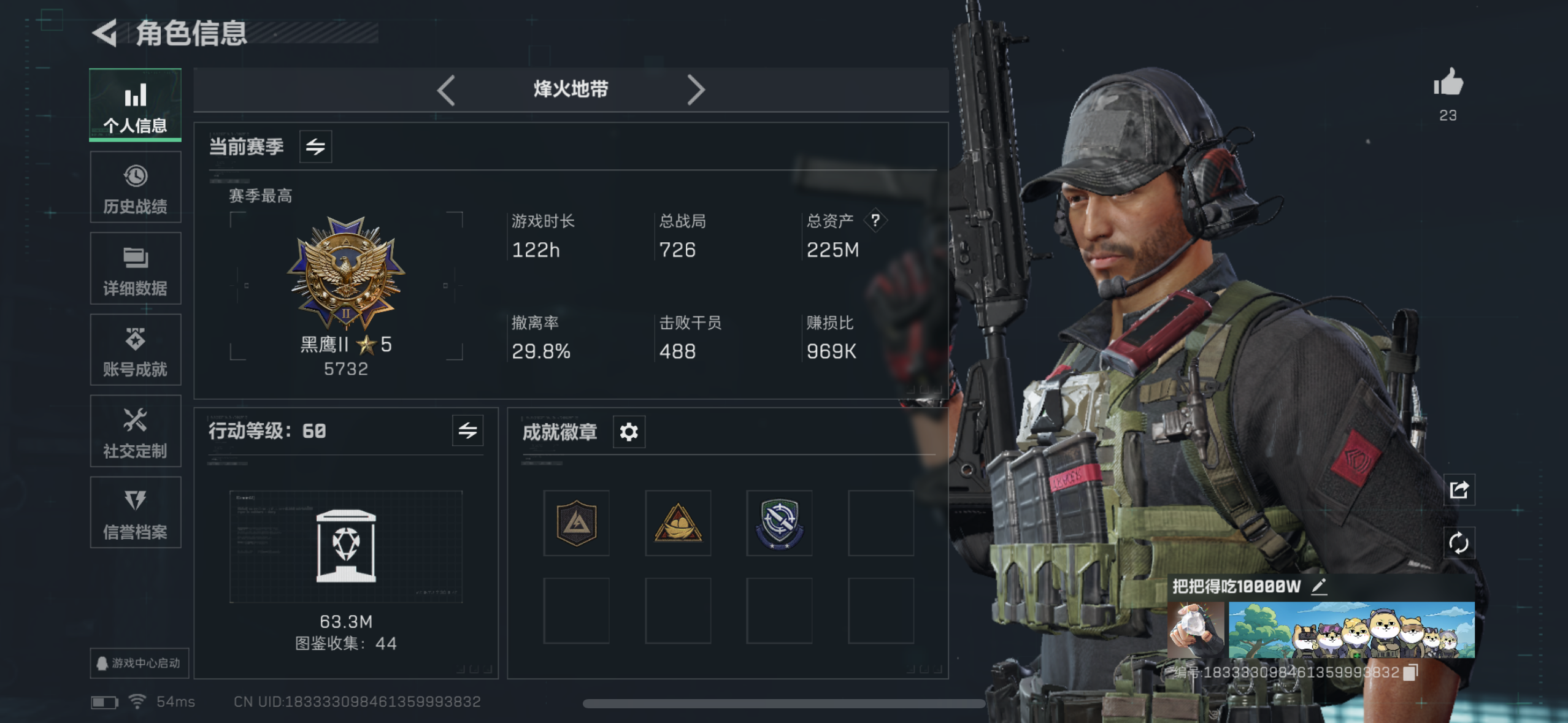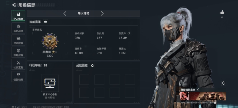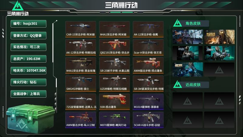 hssjz301 总资产190.63M,哈夫币 107047.56K,战场等级:23 上等兵,行动等