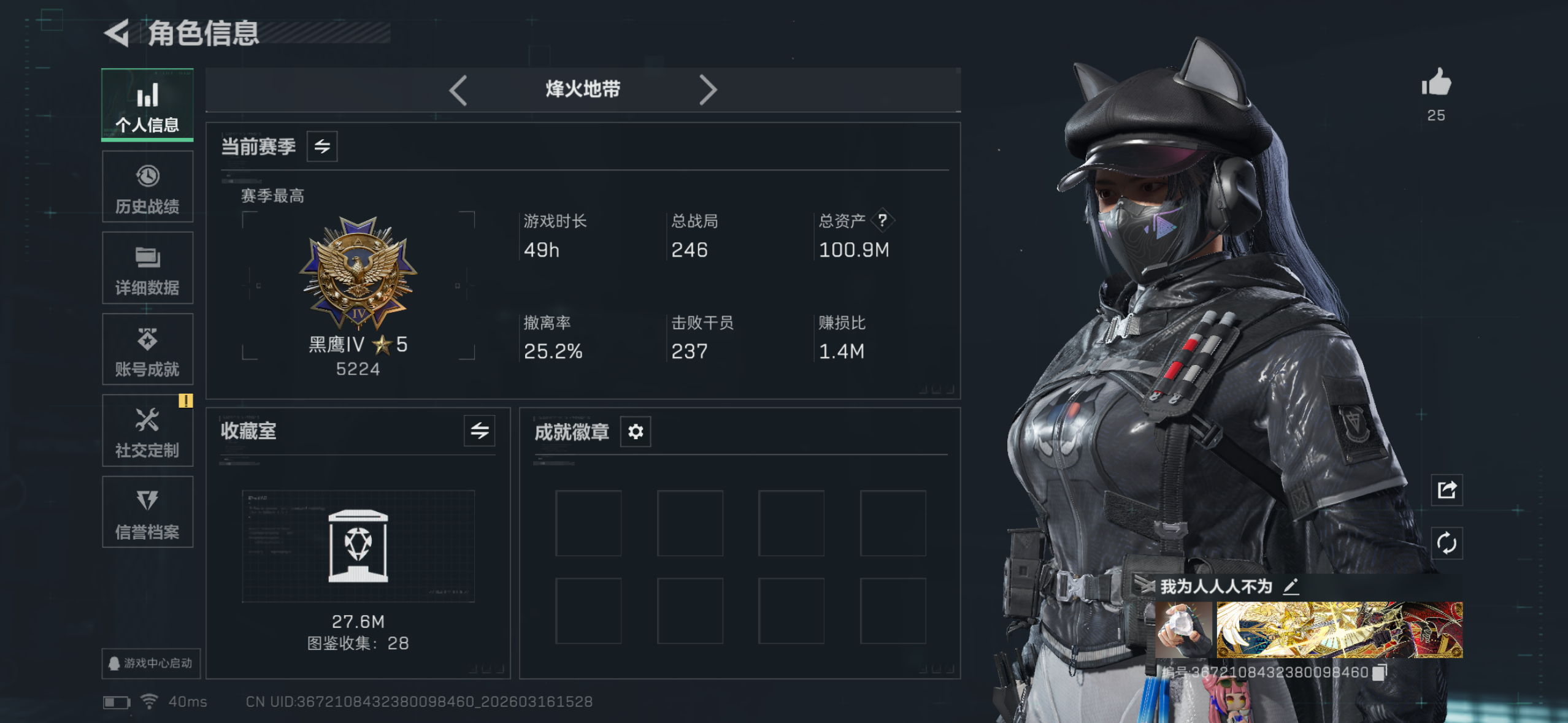 红狼 暗星 烽火地带段位: 黄金 全面战场段位: 上等兵 总