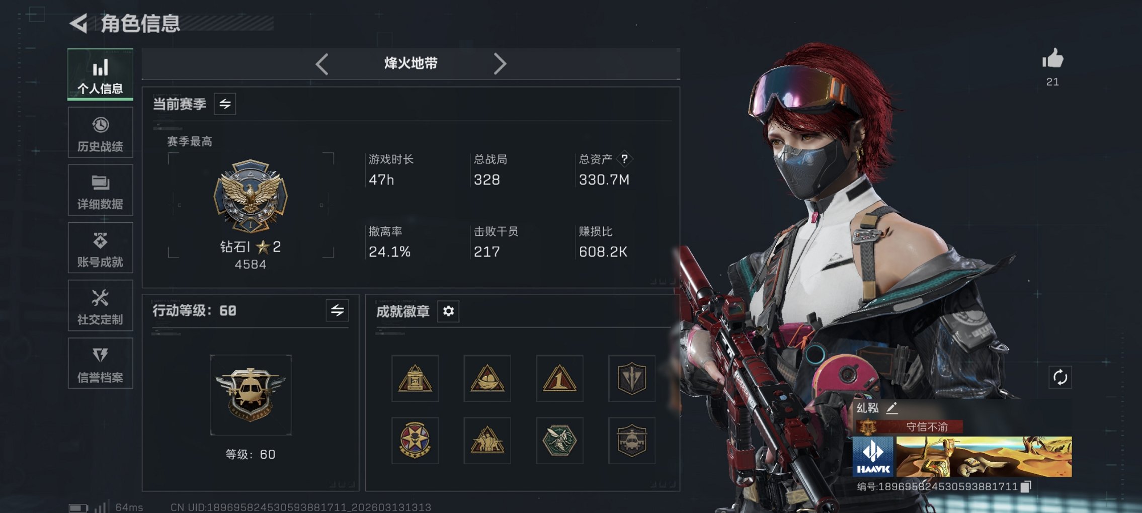 308m总资产-102108k哈伏币-60烽火等级-钻石-1战场等级-无军衔