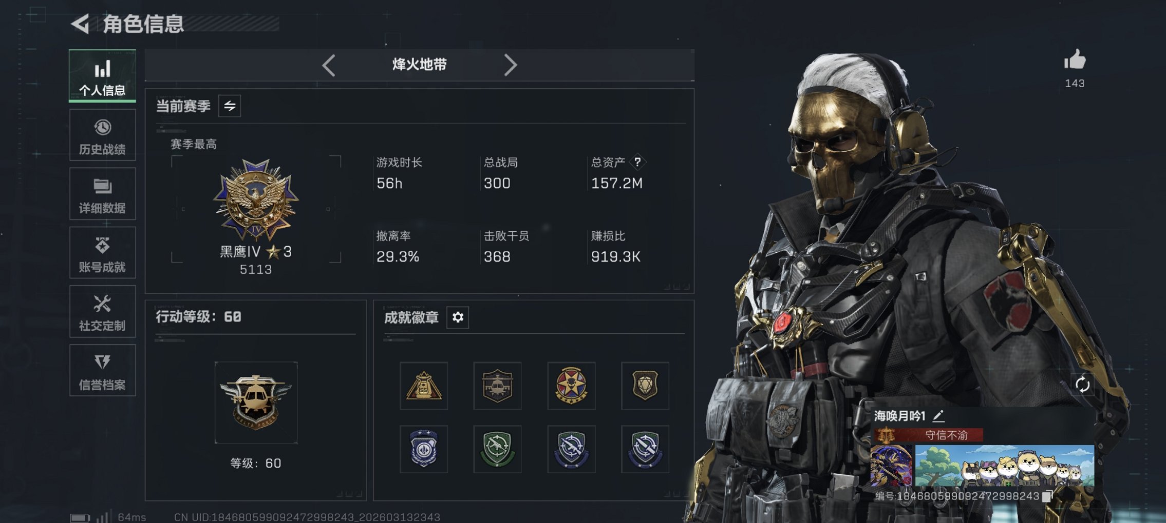 150m总资产-29666k哈伏币-60烽火等级-黑鹰-30战场等级-军士长