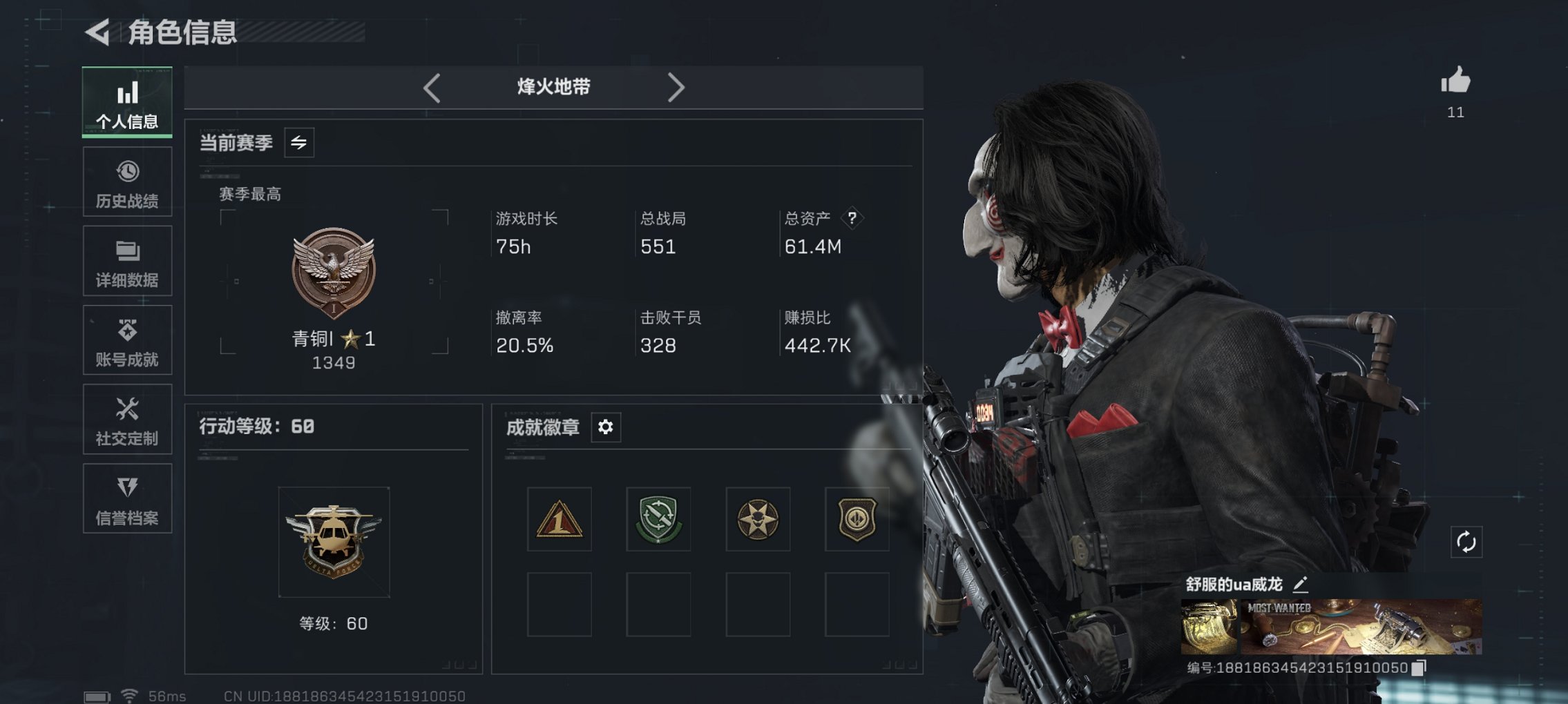 104m总资产-2693k哈伏币-60烽火等级-三角洲巅峰-47战场等级-军士