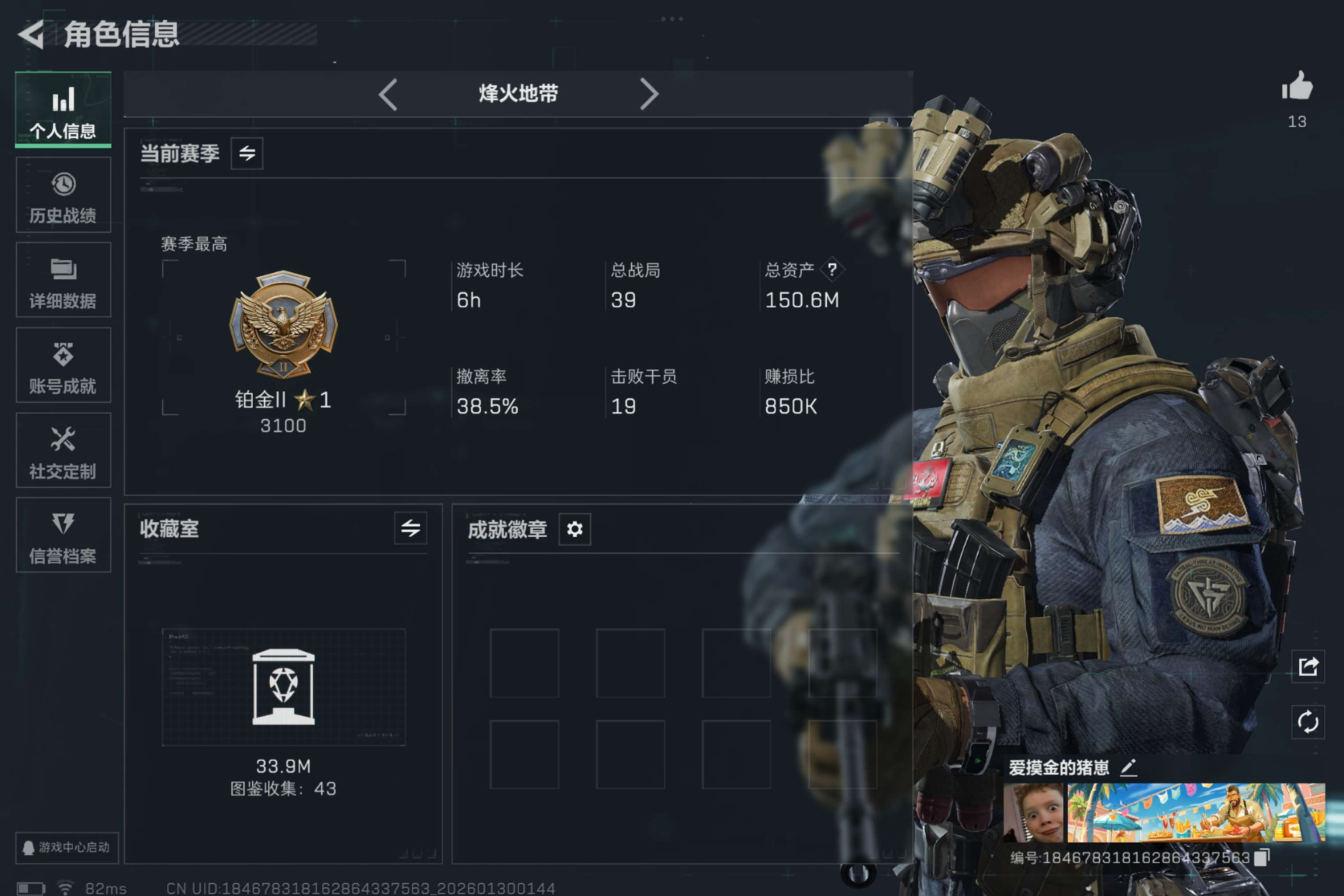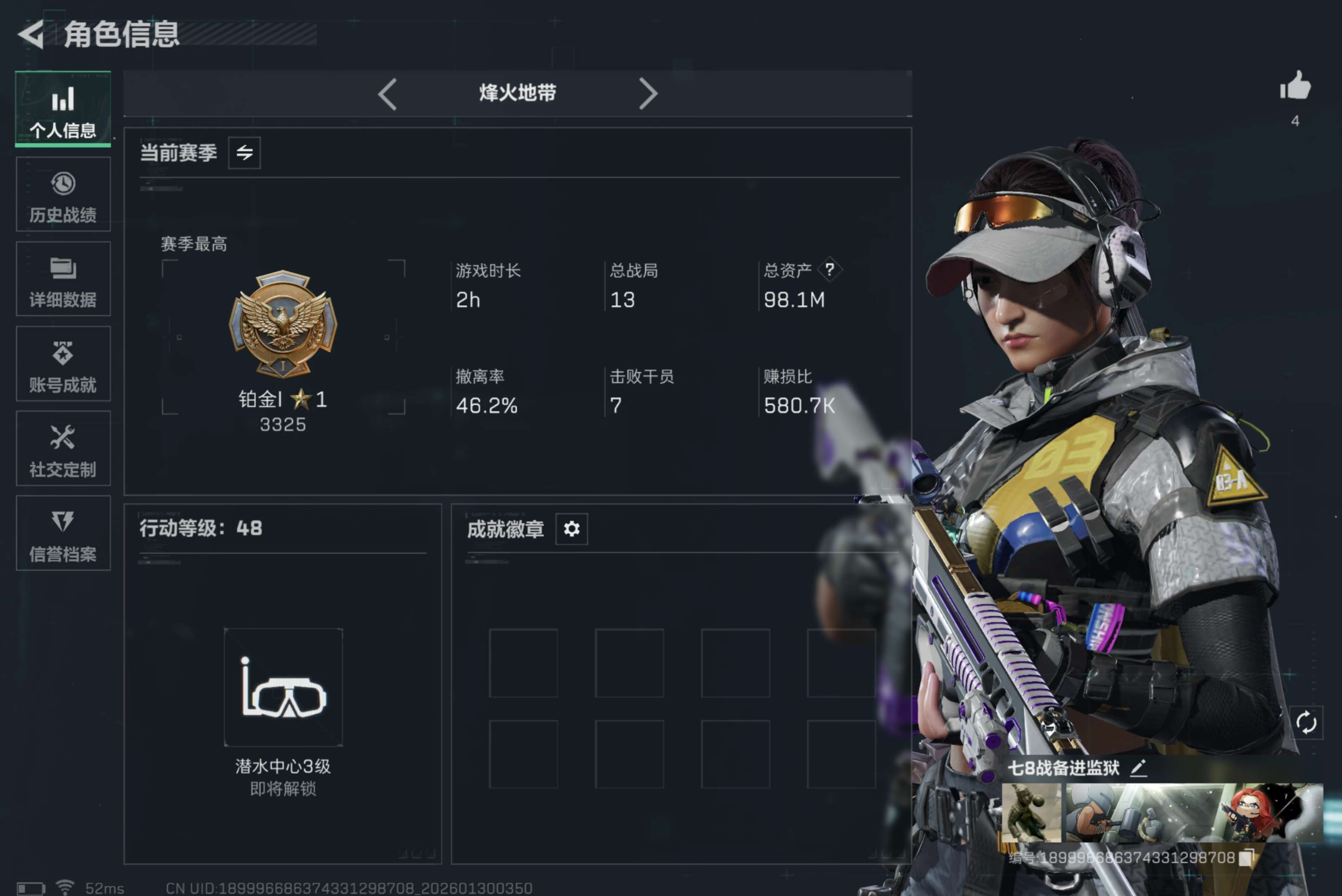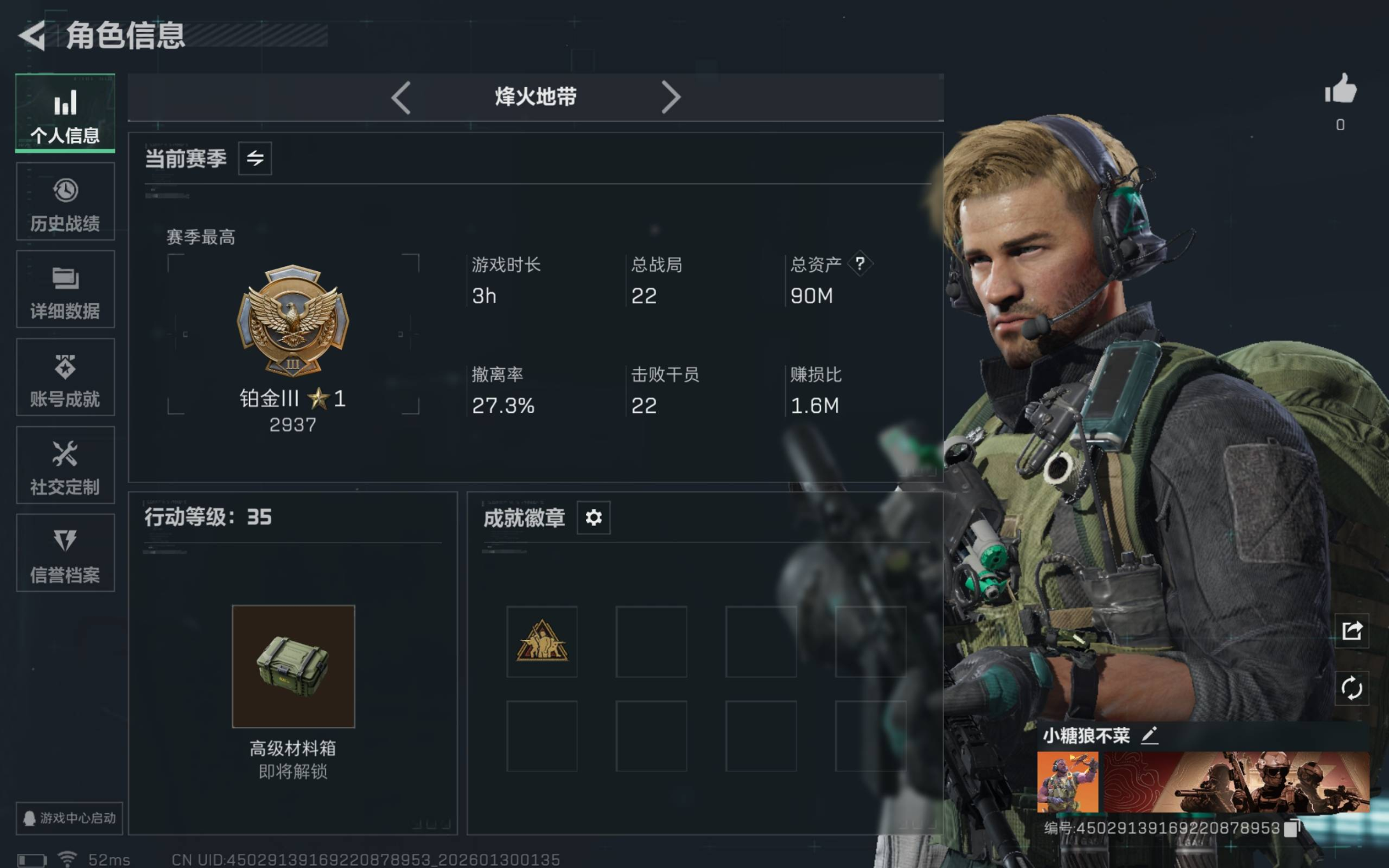 烽火段位暂无段位 战场段位暂无段位 总资产20.5M 哈夫币1371W 挂饰3 载具1