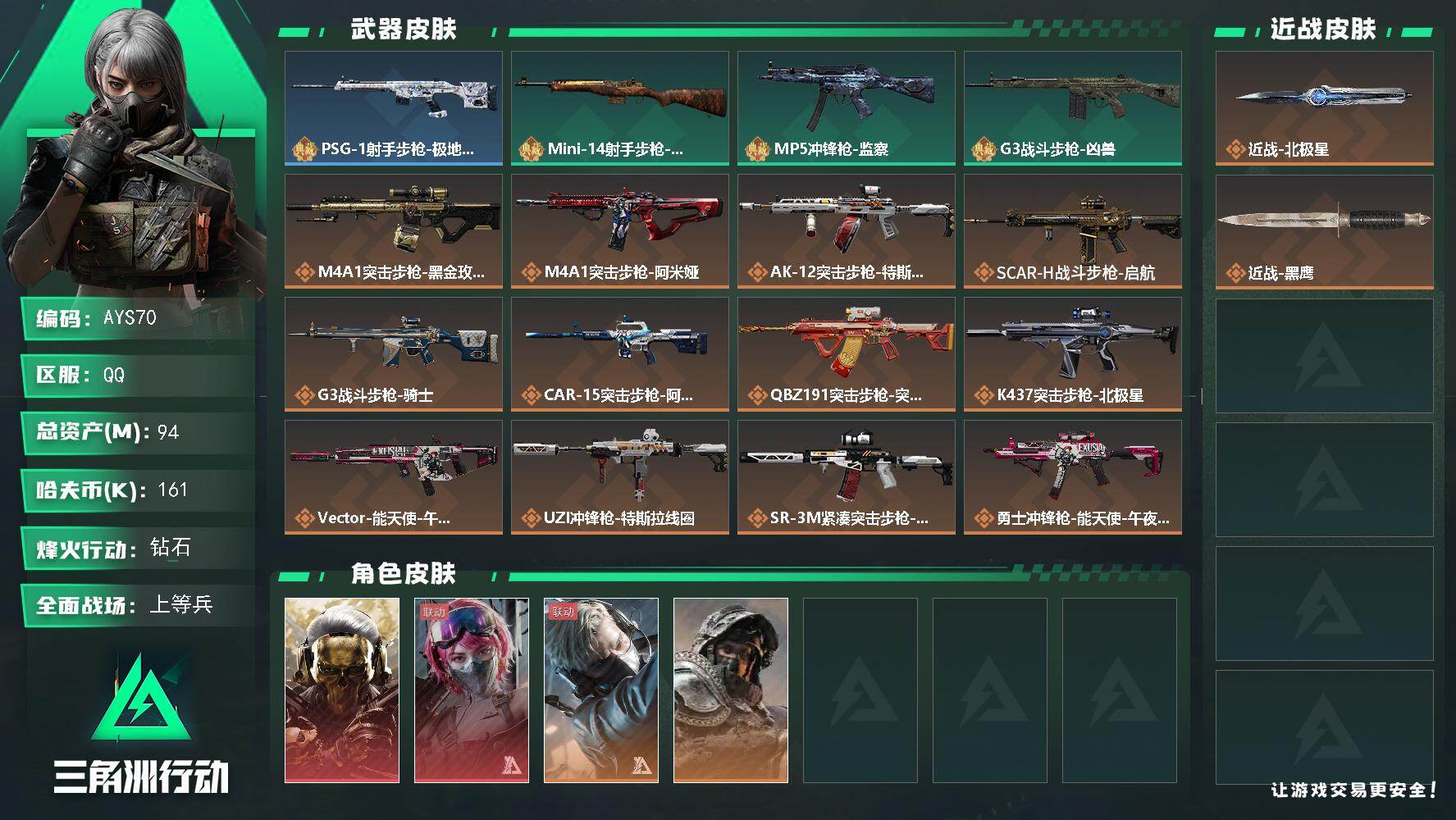 总资产77M【10颗AW子弹】哈夫币57,480K,行动等级:39,仓库等级: