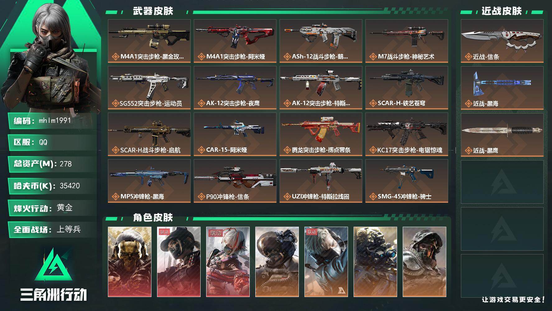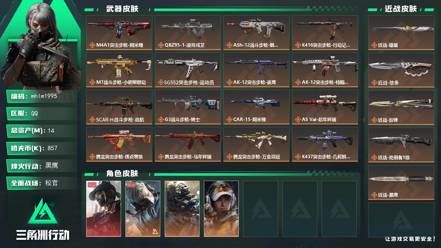 14m总资产-857k哈伏币-60烽火等级-黑鹰-50战场等级-校官【干员外