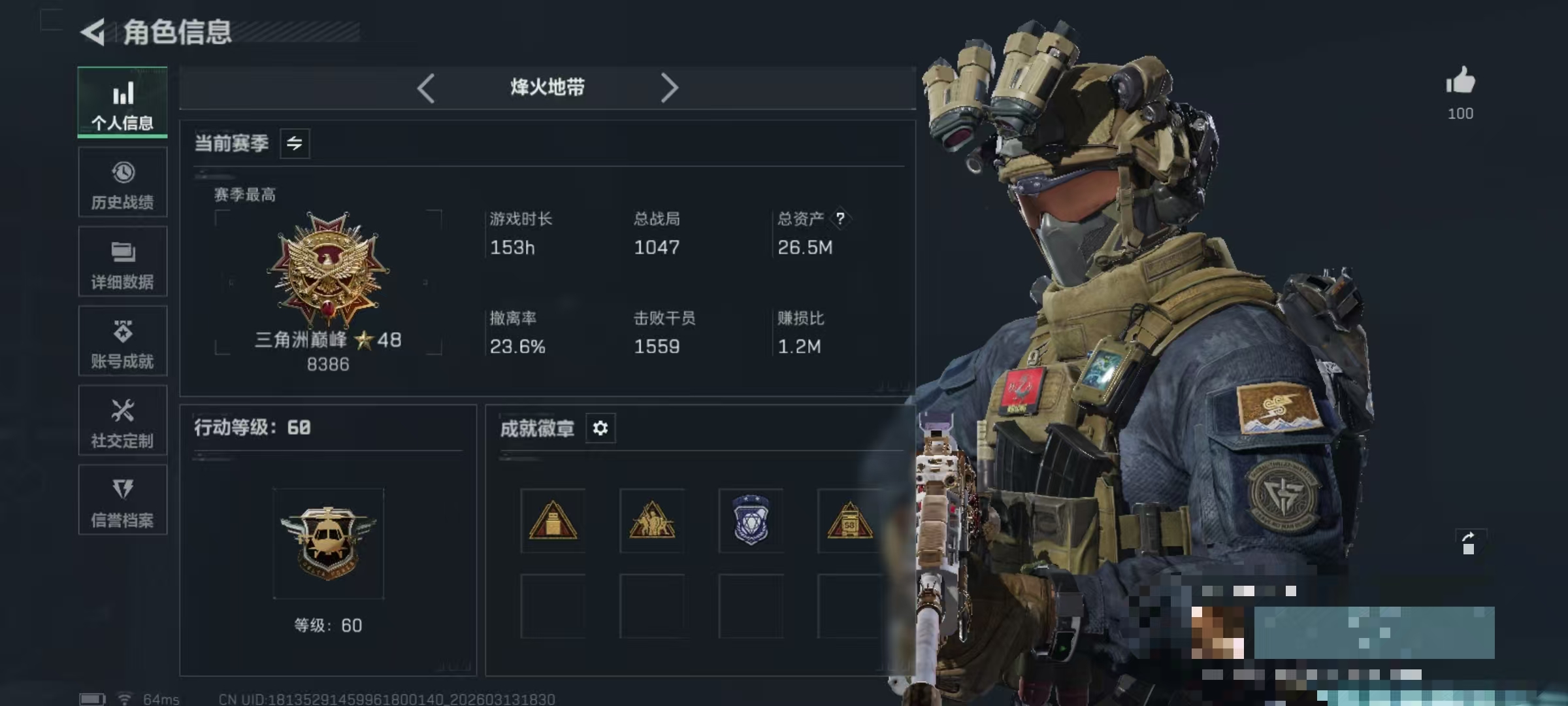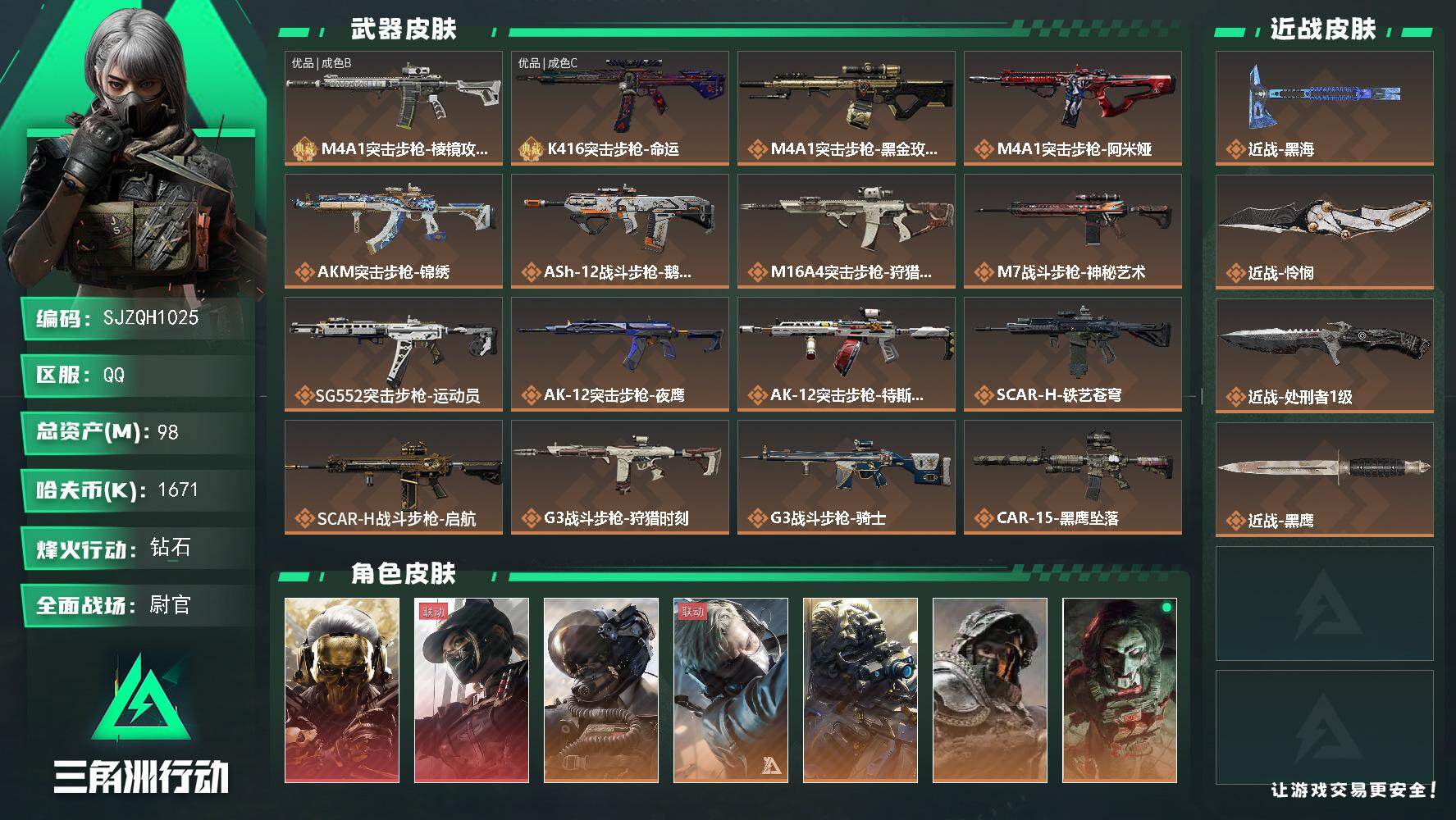 98m总资产-1671k哈伏币-60烽火等级-钻石-50战场等级-尉官【干员
