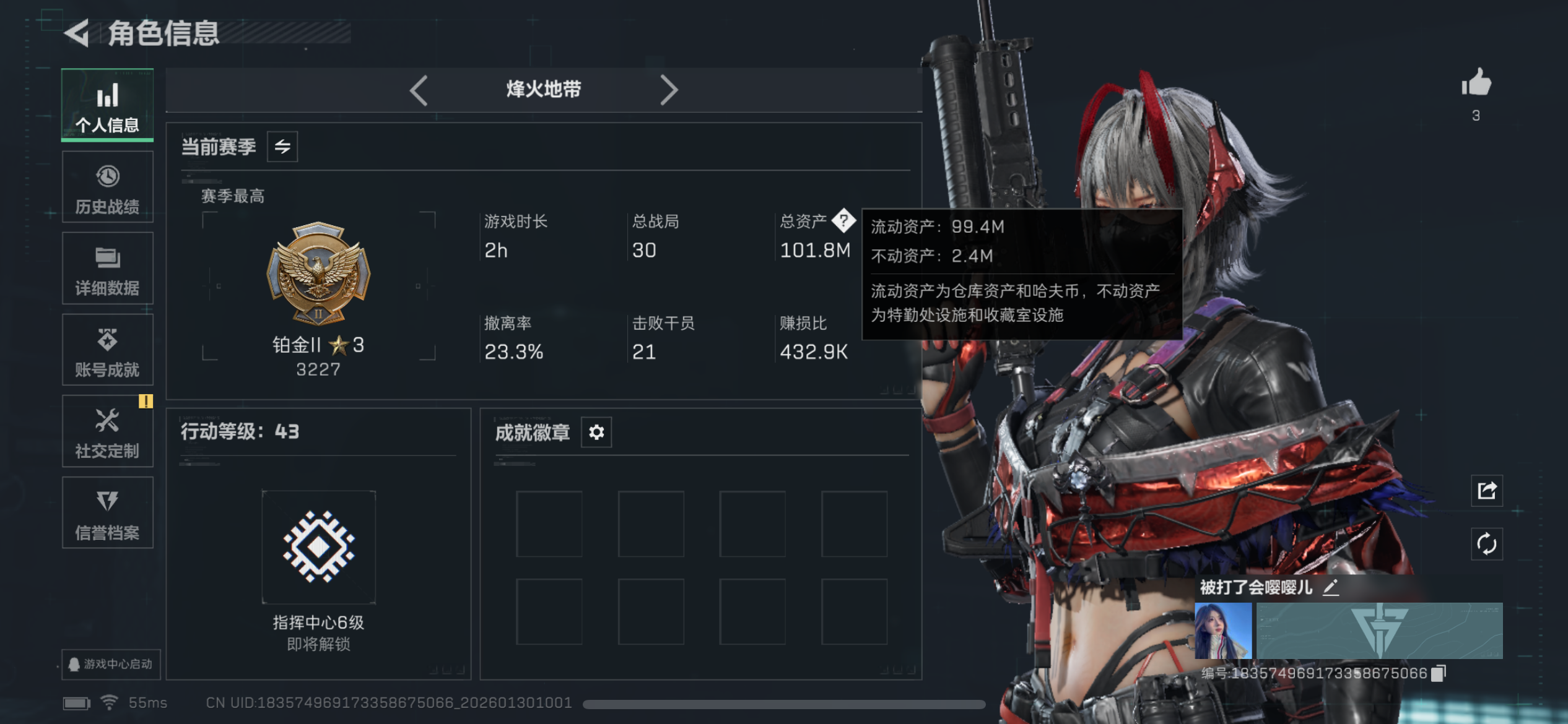 总资产(M):149M/哈夫币(K):85065K/传说枪皮数:3/全面战场等级:20_段位:上等兵/烽火地带等级:60_段位:白银