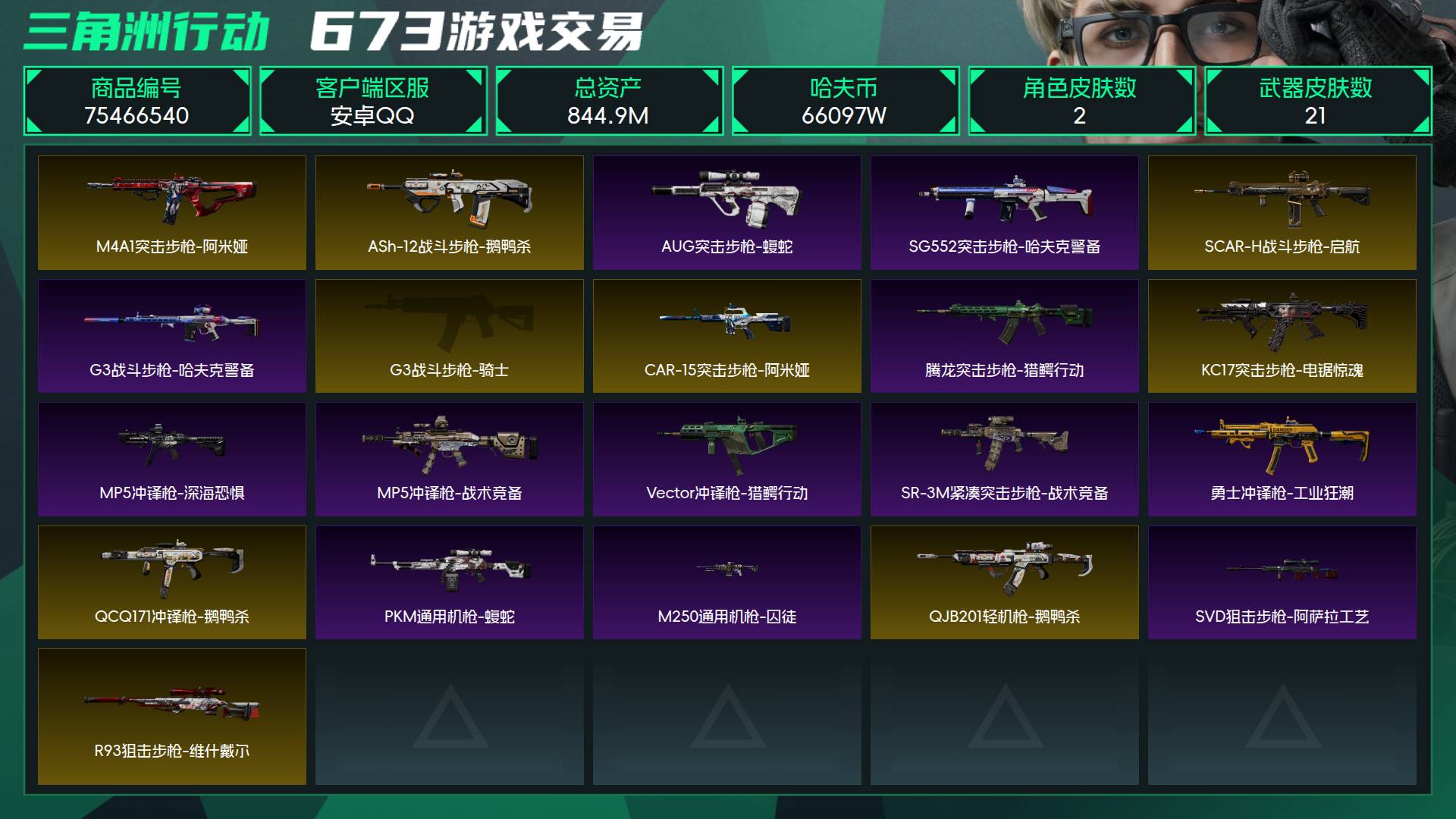 烽火段位黄金3 战场段位暂无段位 总资产844.9M 哈夫币66097W 干员2 挂饰14 近战1 枪械21 载具7