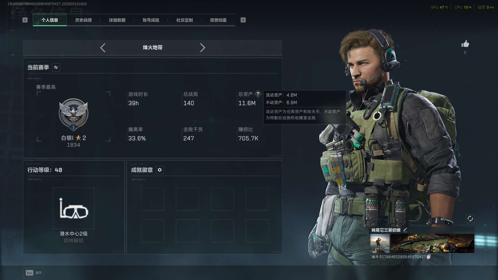 总资产(M):230M/哈夫币(K):47835K/传说枪皮数:18/全面战场等级:2_段位:无段位/烽火地带等级:60_段位:铂金/