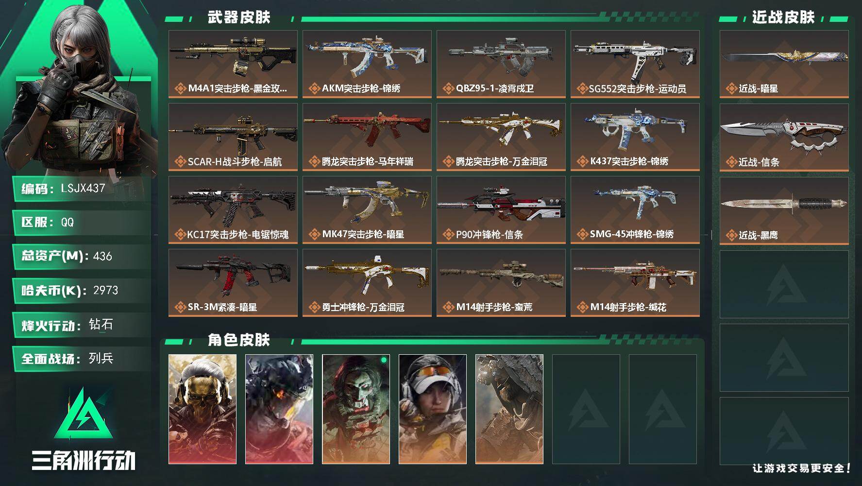 436m总资产-2973k哈伏币-60烽火等级-钻石-16战场等级-列兵