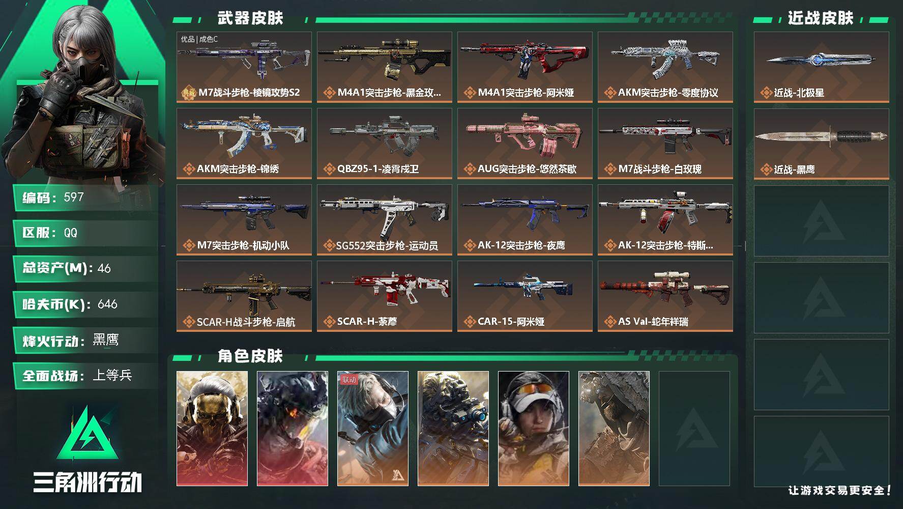 总资产:232.1M 2干员外观 1近战传说 32传说枪械 哈夫币:101000K