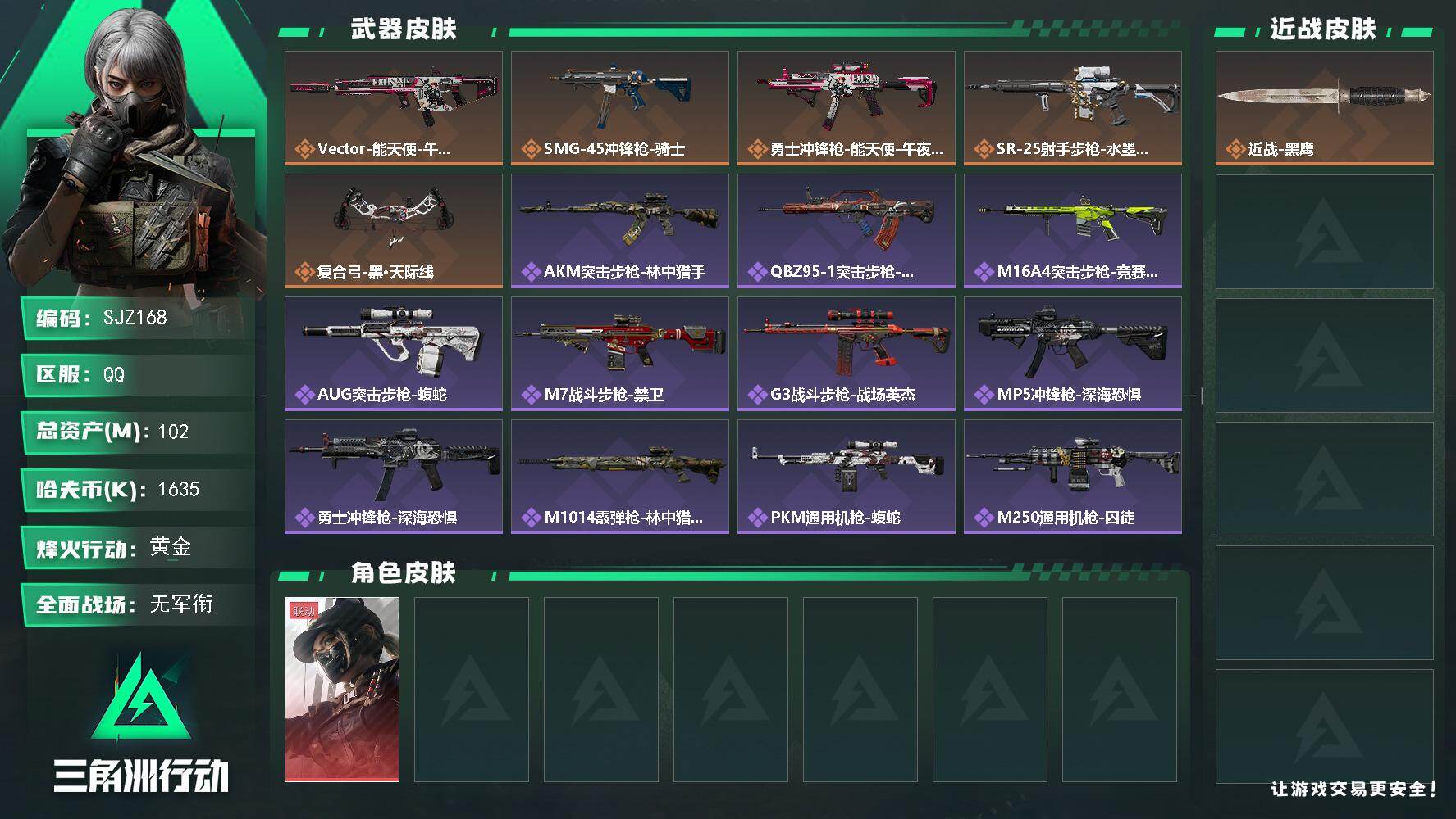 102m总资产-1635k哈伏币-52烽火等级-黄金-1战场等级-无军衔【干