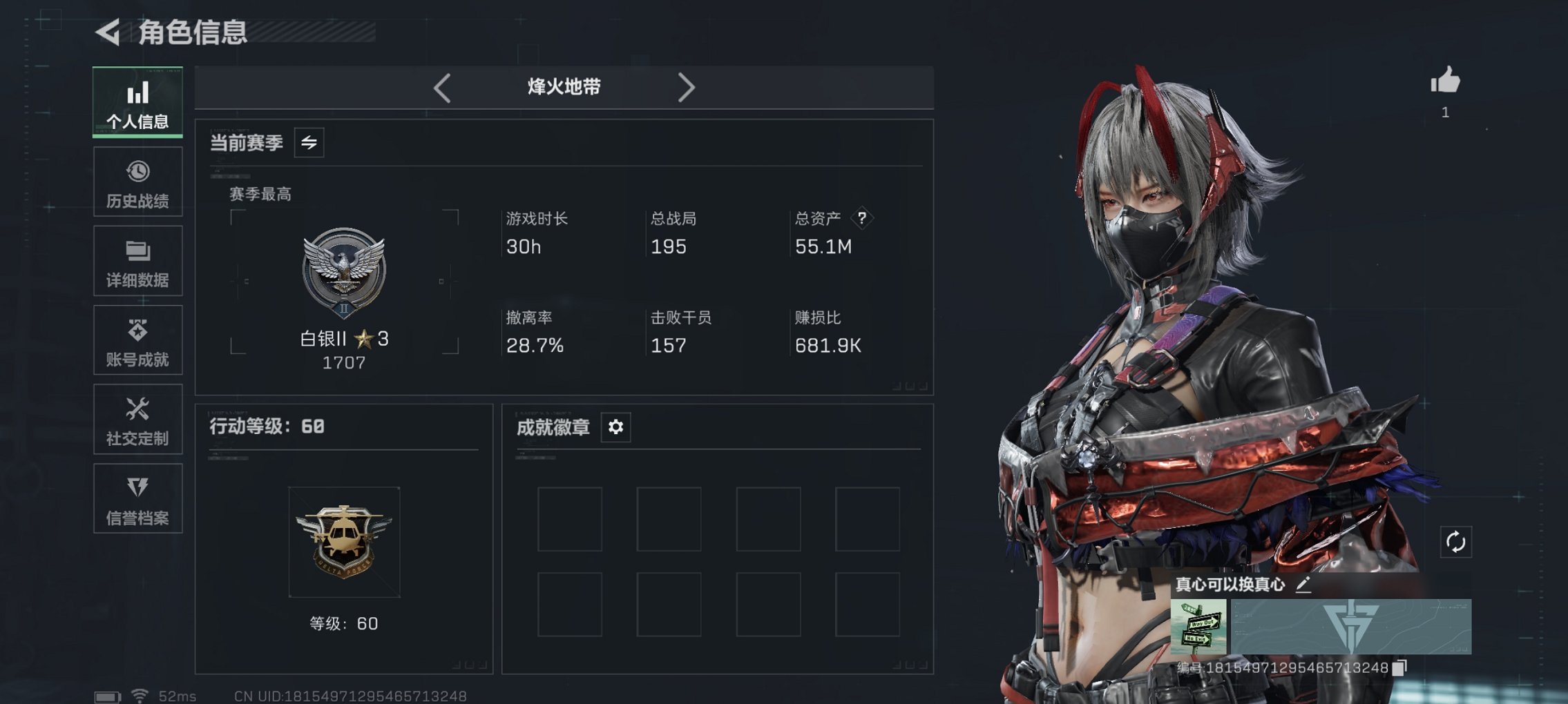 总资产40M,哈夫币58K,行动等级:60,干员红皮数量:1