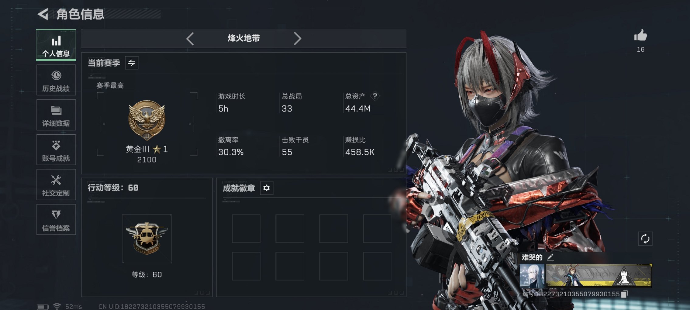 总资产2M,哈夫币253K,行动等级:33,干员红皮数量:1