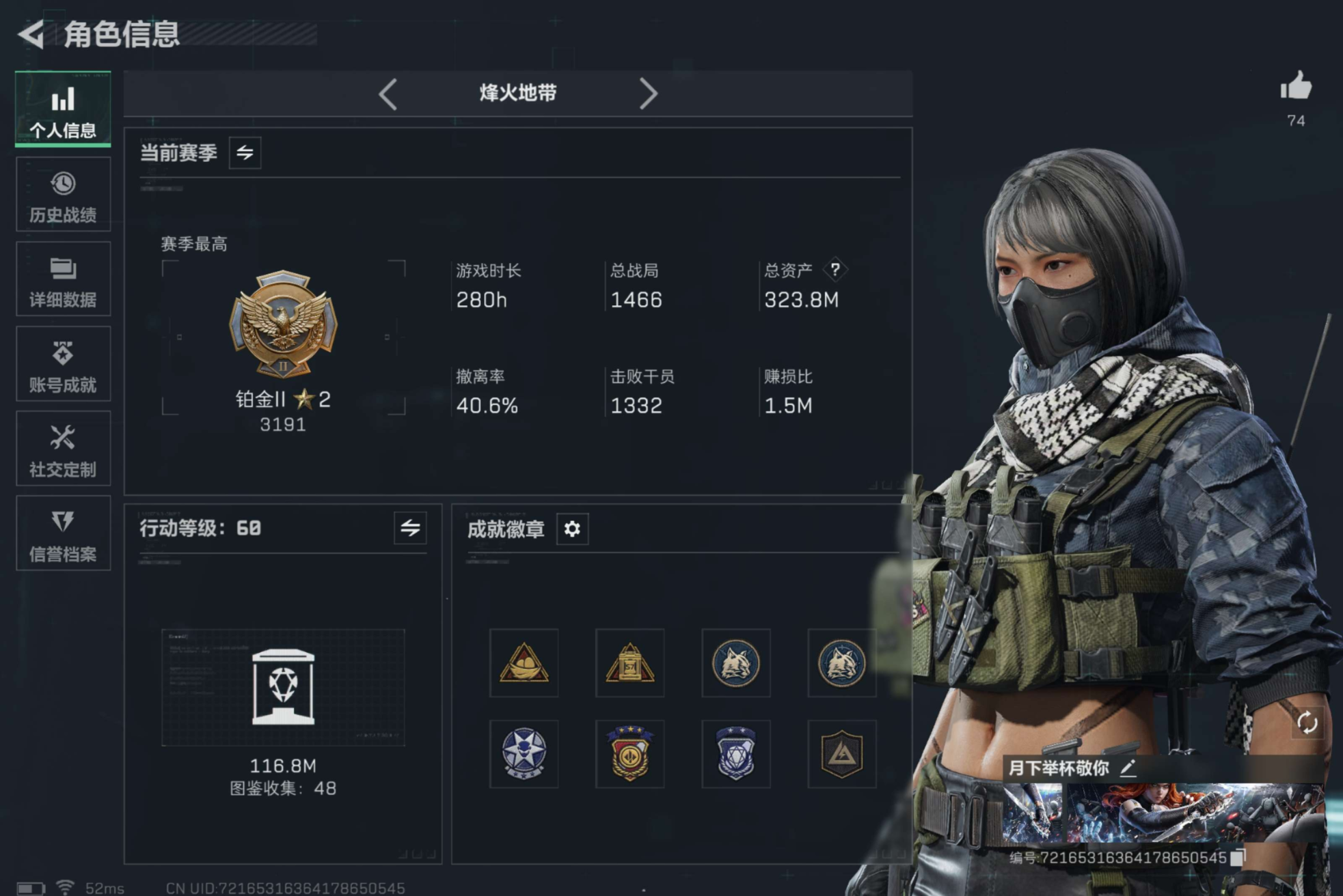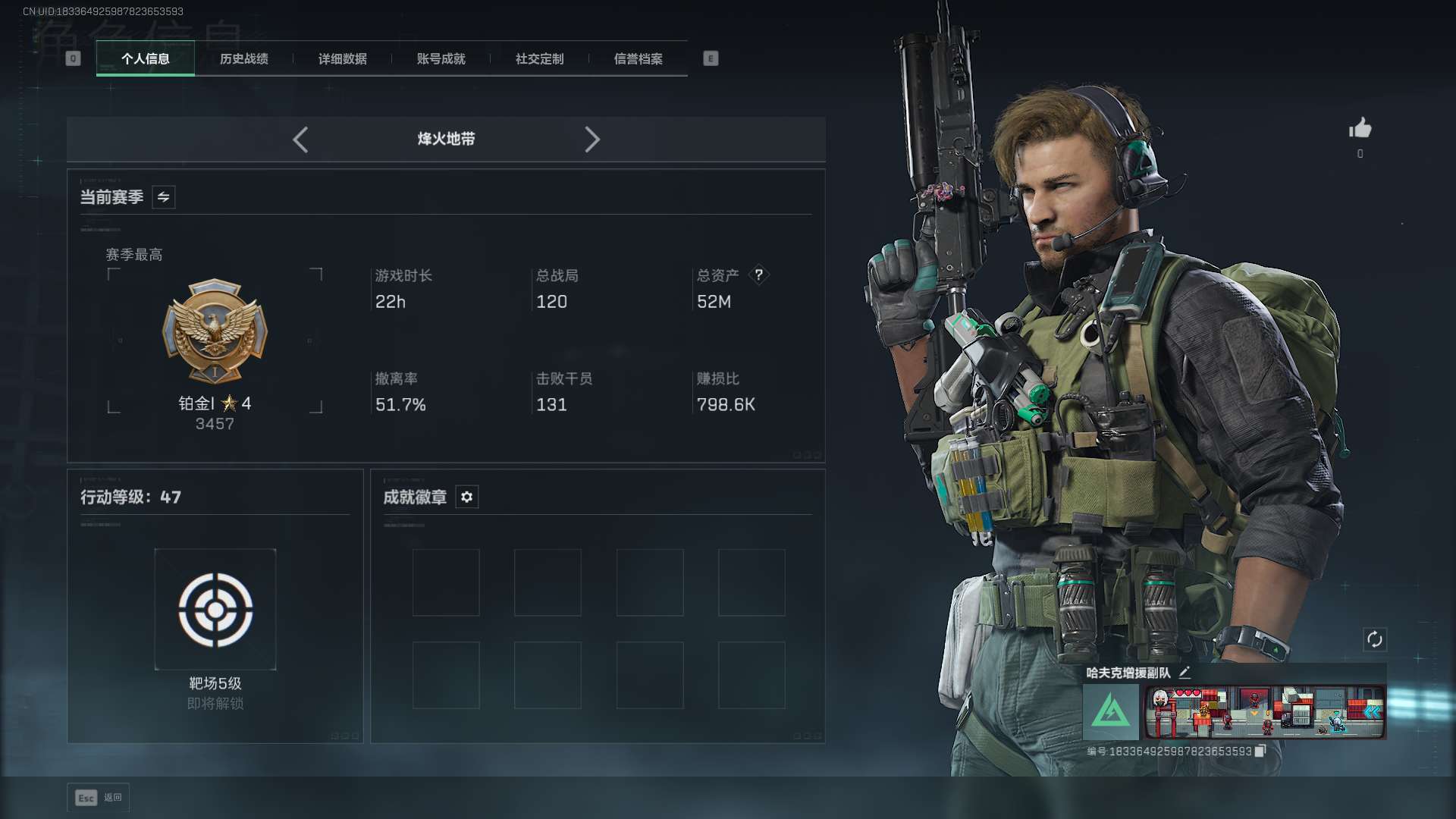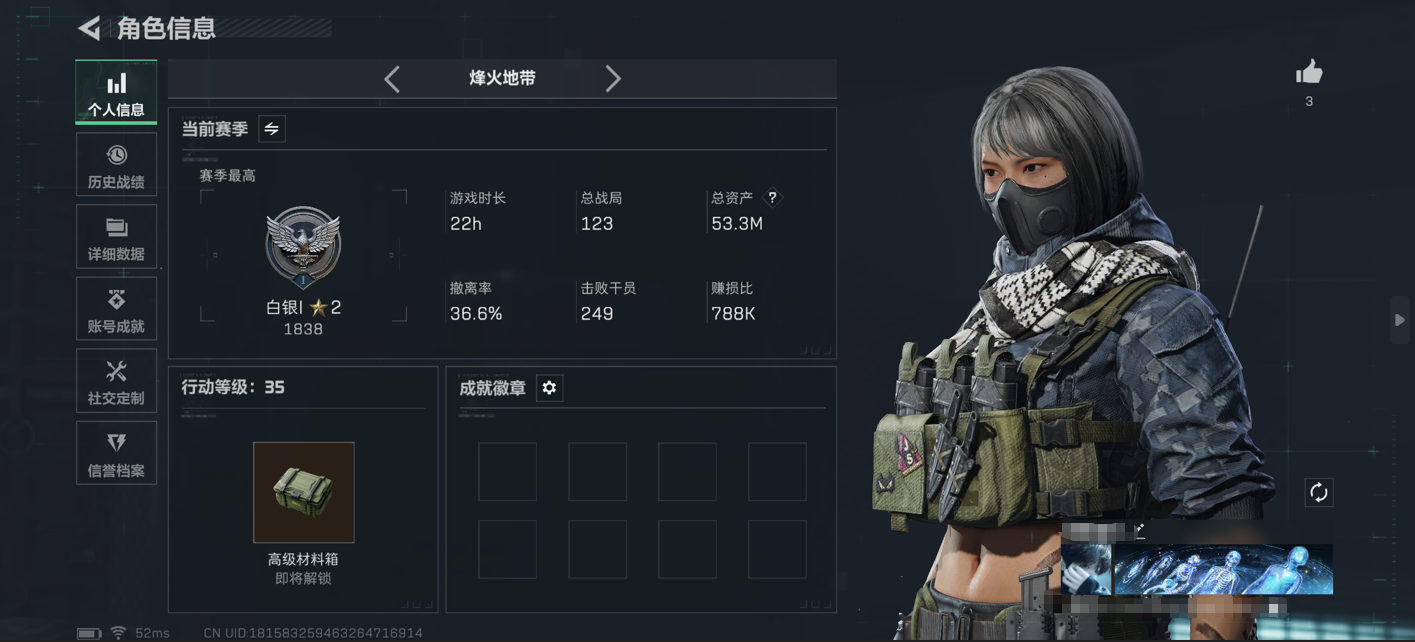 烽火段位铂金2 战场段位暂无段位 总资产49.3M 哈夫币12W 干员2 挂饰15 近战1 枪械32 载具12