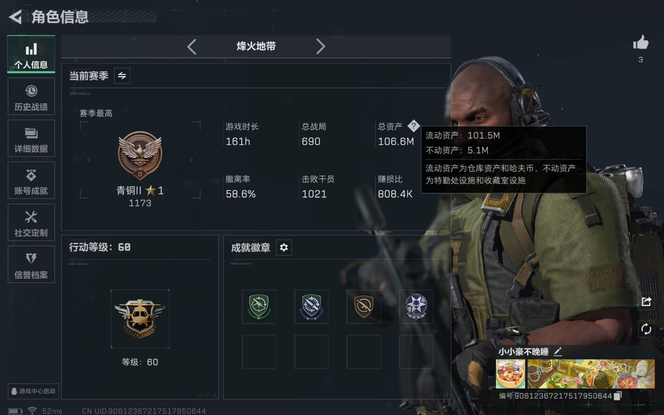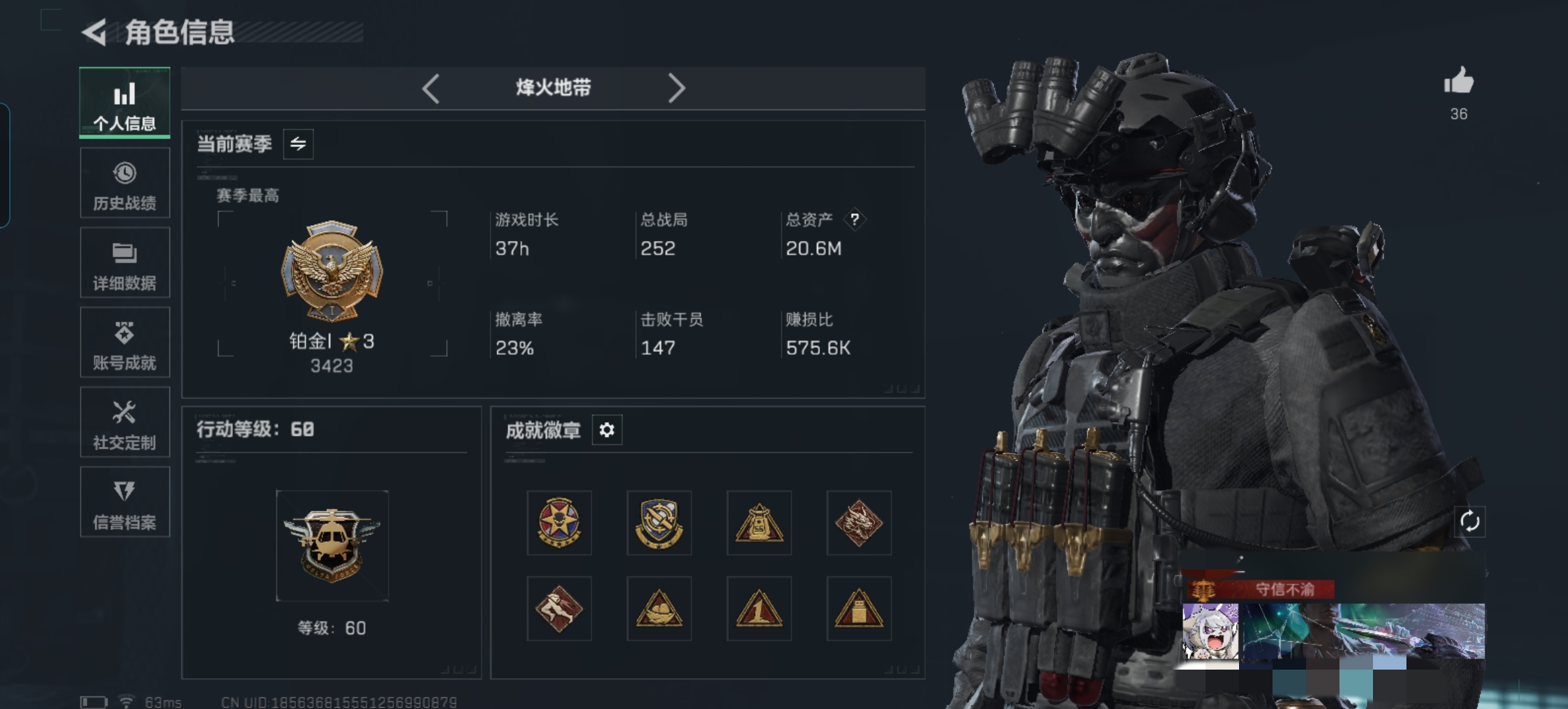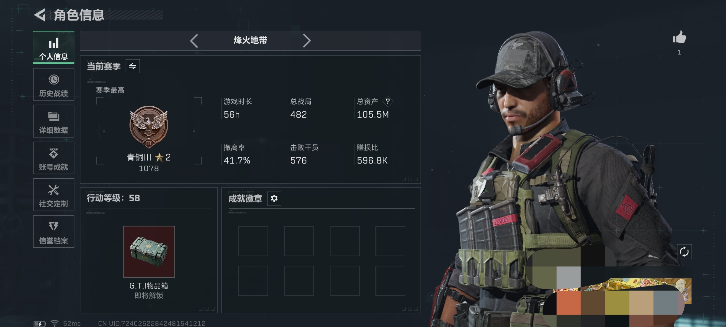 烽火段位铂金2 战场段位暂无段位 总资产49.3M 哈夫币12W 干员2 挂饰15 近战1 枪械32 载具12