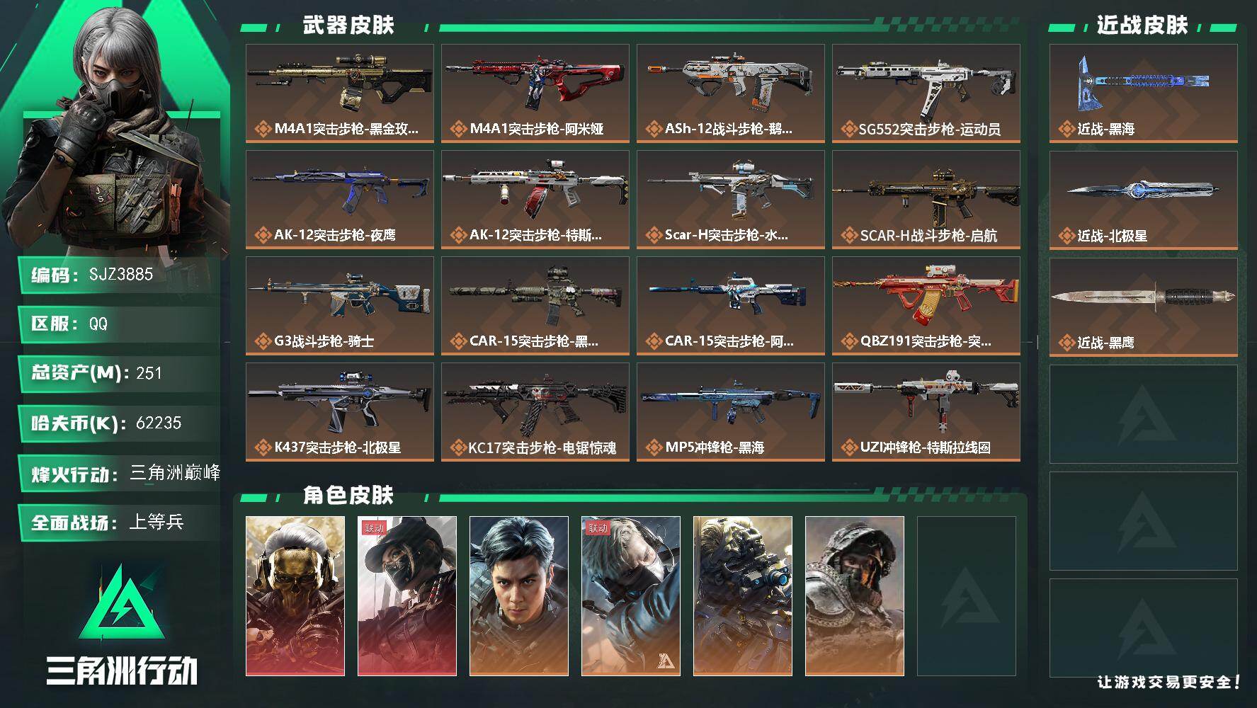 总资产(M):251M/哈夫币(K):62235K传说枪皮数:29/全面战场等级:28_段位:上等兵/烽火地带等级:60_段位:三角洲巅峰/