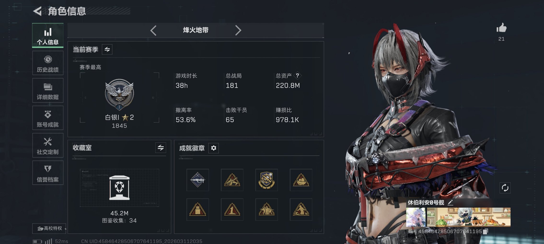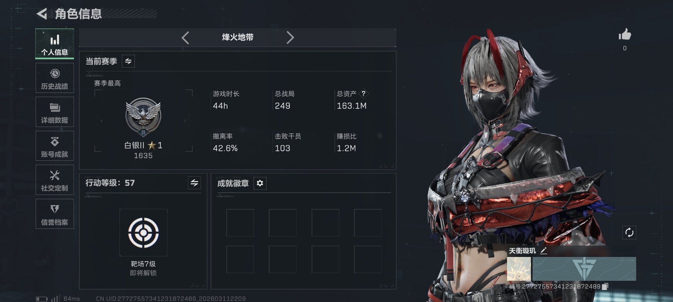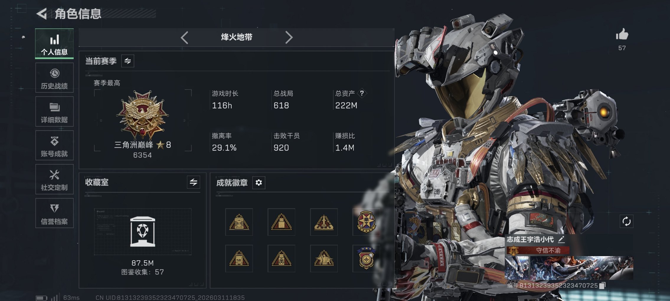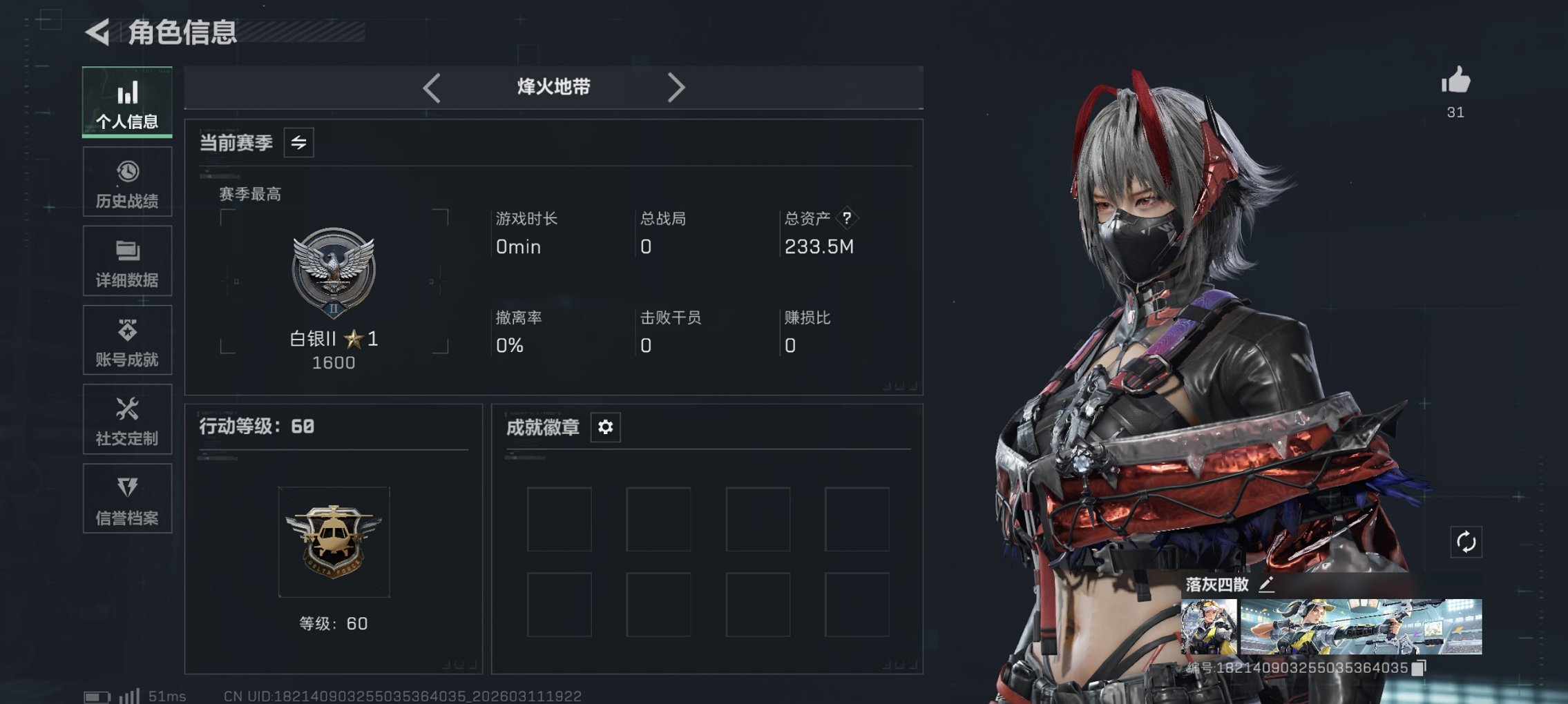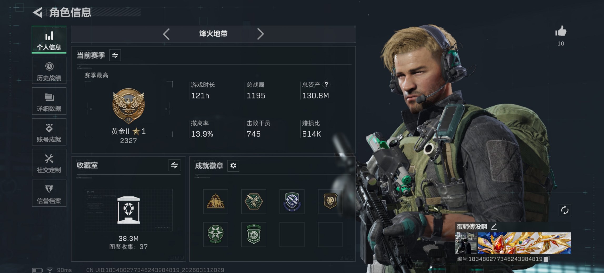 200m总资产-42597k哈伏币-60烽火等级-白银-27战场等级-列兵【