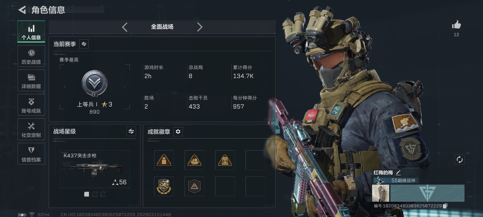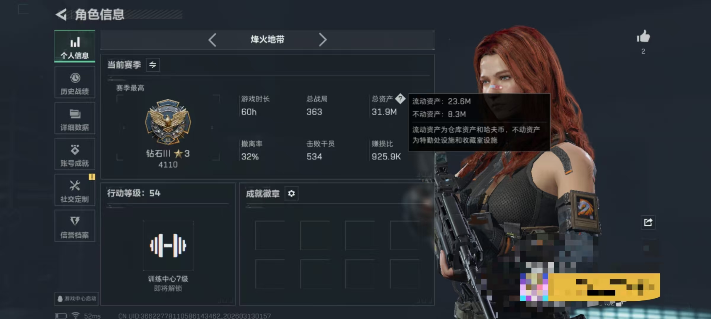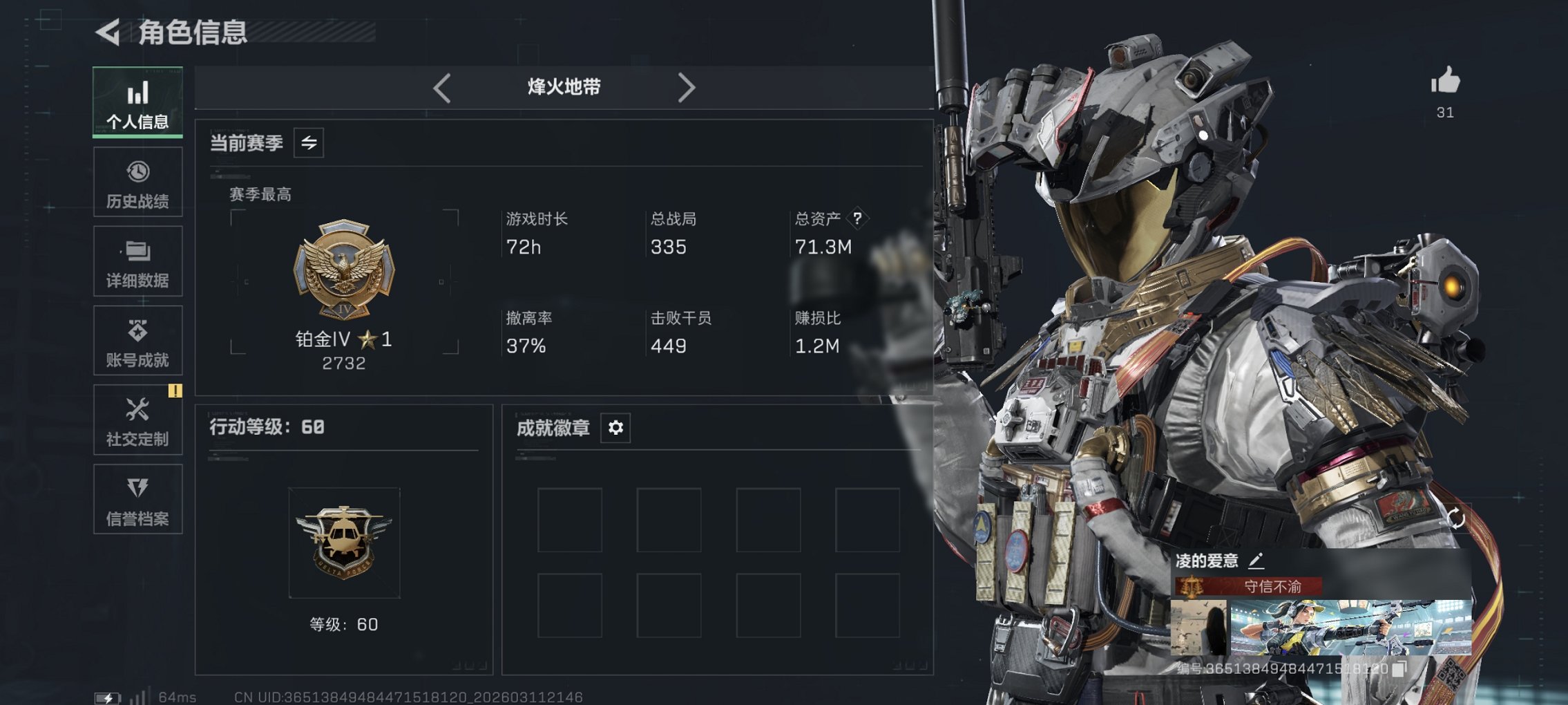 270m总资产-25555k哈伏币-60烽火等级-铂金-26战场等级-上等兵