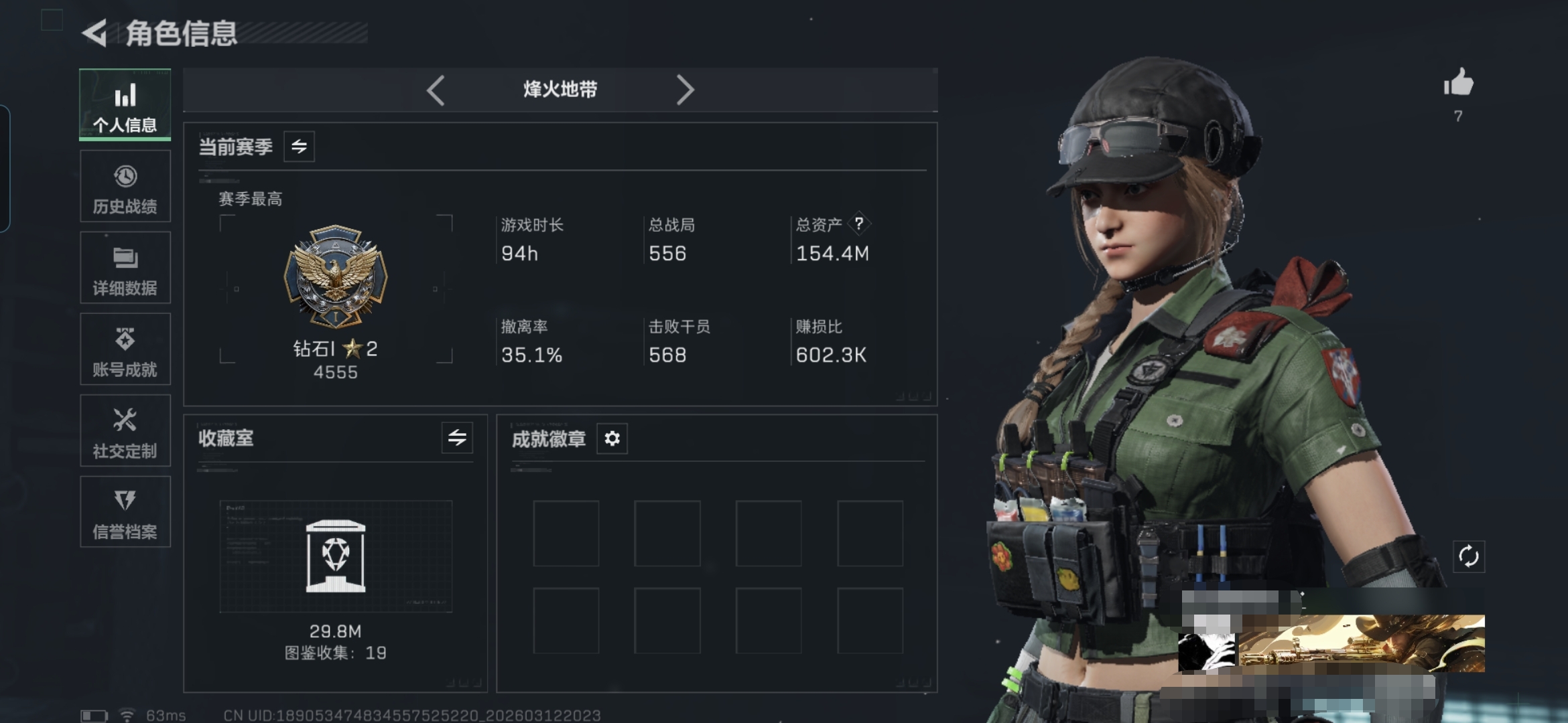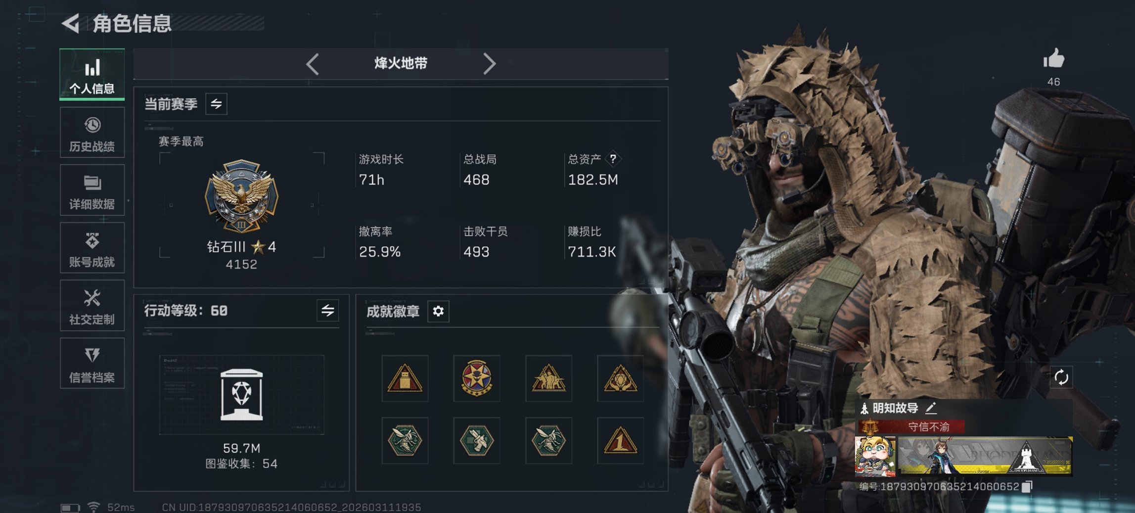 68m总资产-447k哈伏币-60烽火等级-钻石-29战场等级-上等兵【干员