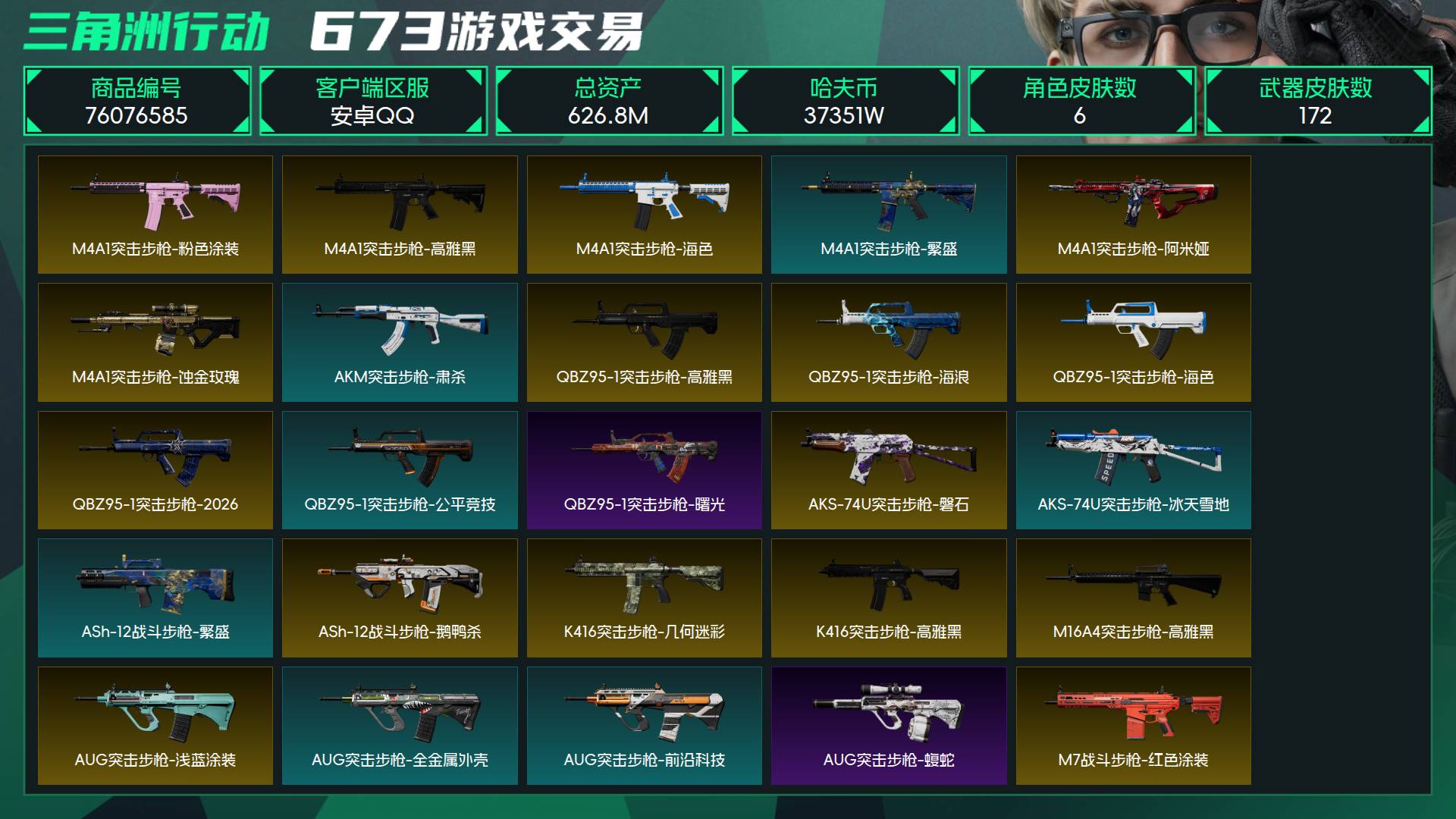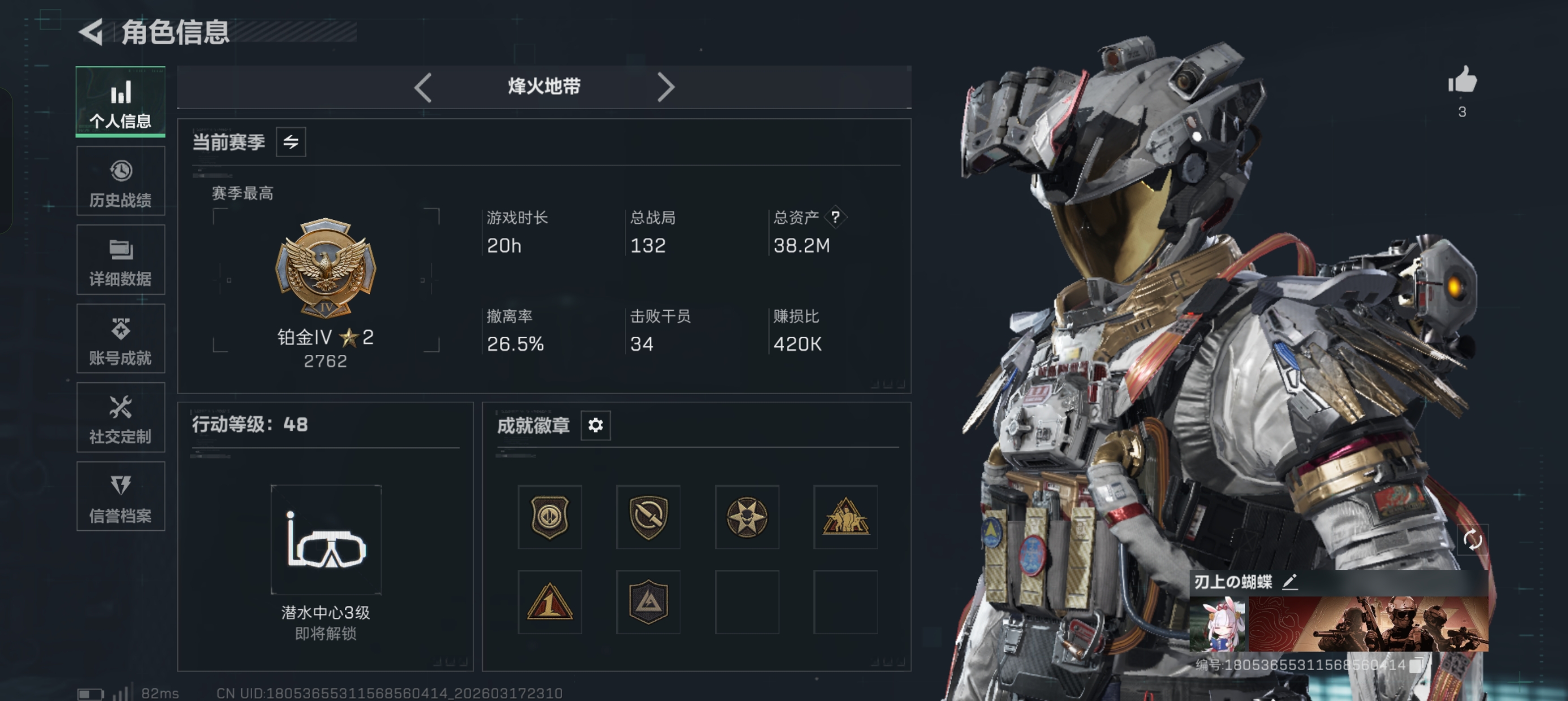 烽火段位钻石5 战场段位上等兵1 总资产626.8M 哈夫币37351W 干员6 挂饰20 近战2