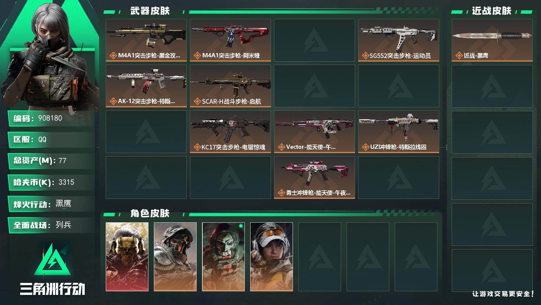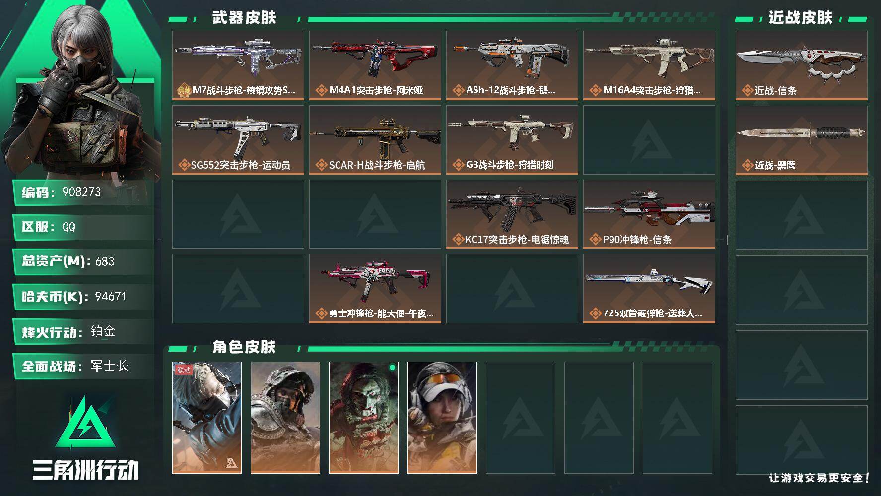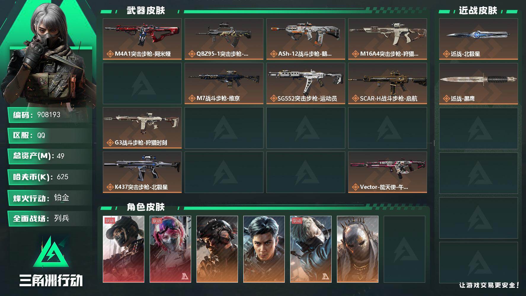 烽火段位黑鹰2 战场段位军士长2 总资产263.1M 哈夫币16168W 干员1 挂饰21 近战2