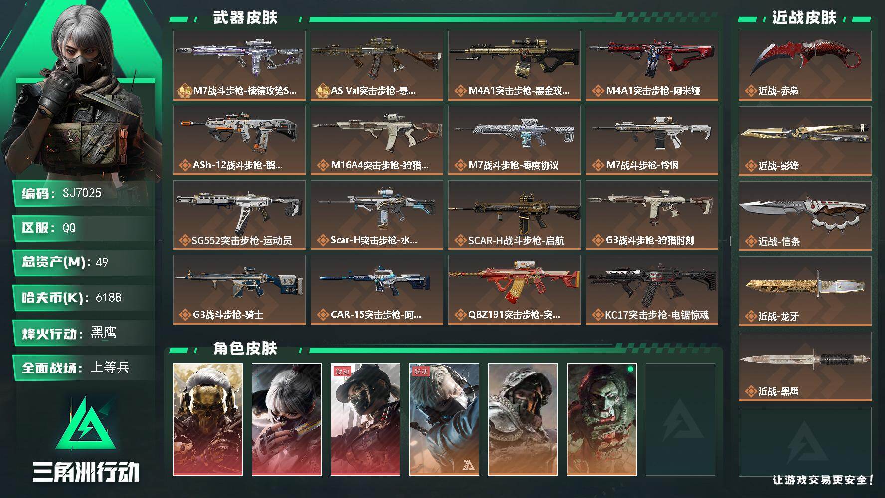 总资产(M):49M/哈夫币(K):6188K/哈夫币(K):6188K/传说枪皮数:27/全面战场