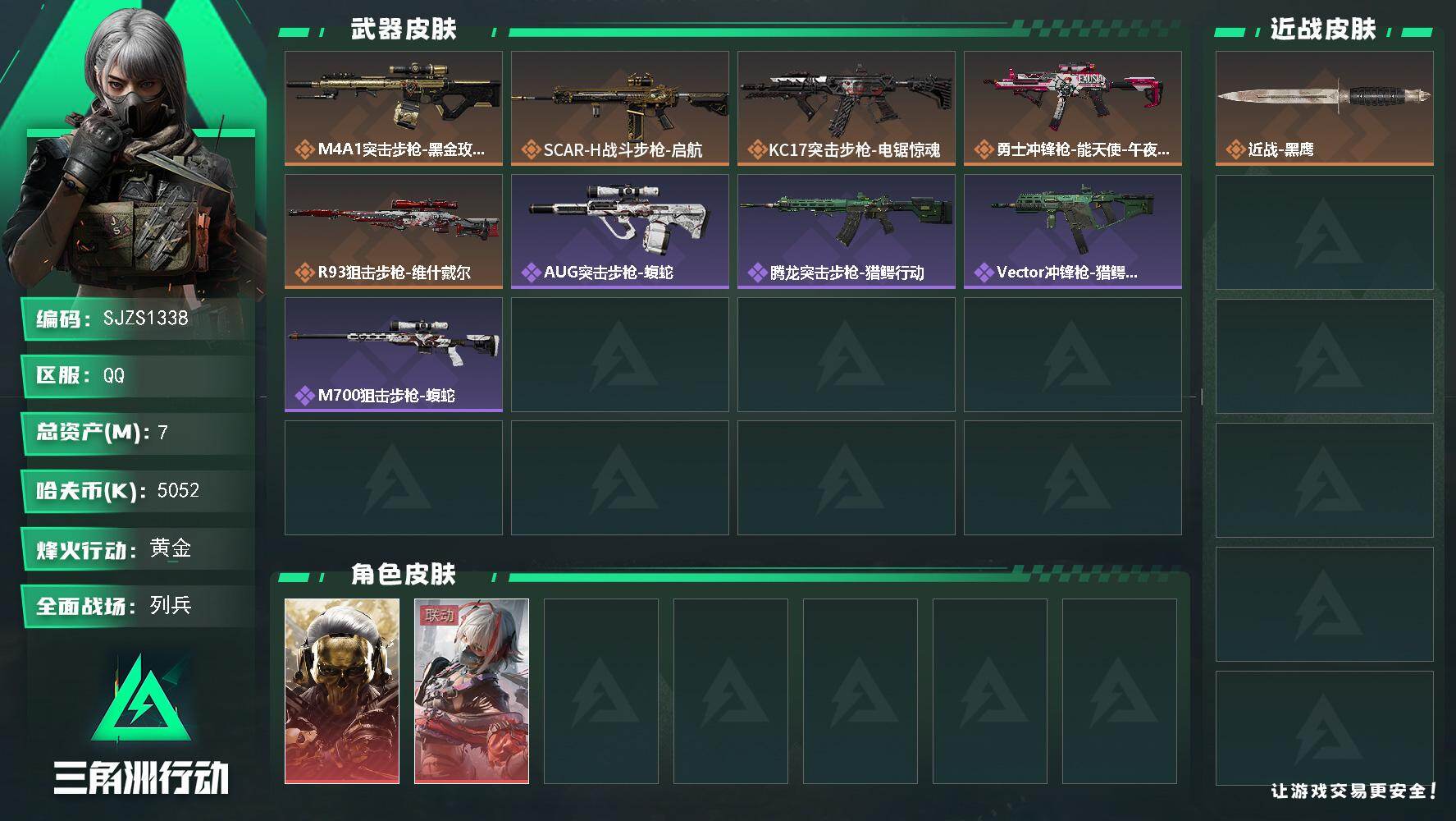 总资产(M):7M/哈夫币(K):5052K/哈夫币(K):5052K/传说枪皮数:5/全面战场等级