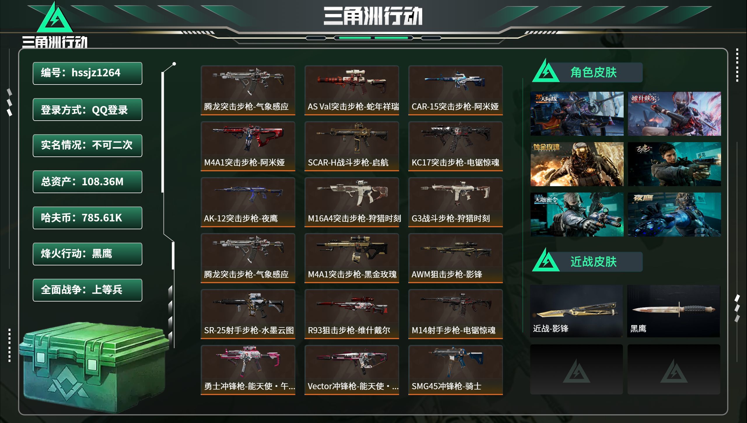 hssjz1264 总资产108.36M,哈夫币 785.61K,战场等级:20 上等兵,行动等级: