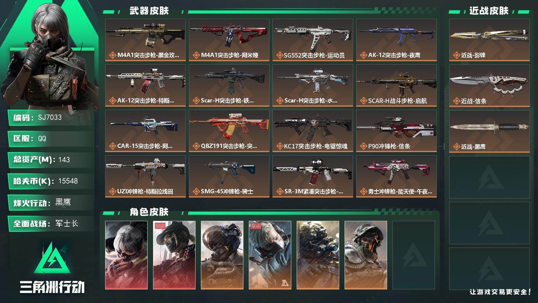 总资产(M):143M/哈夫币(K):15548K/哈夫币(K):15548K/传说枪皮数:24/全