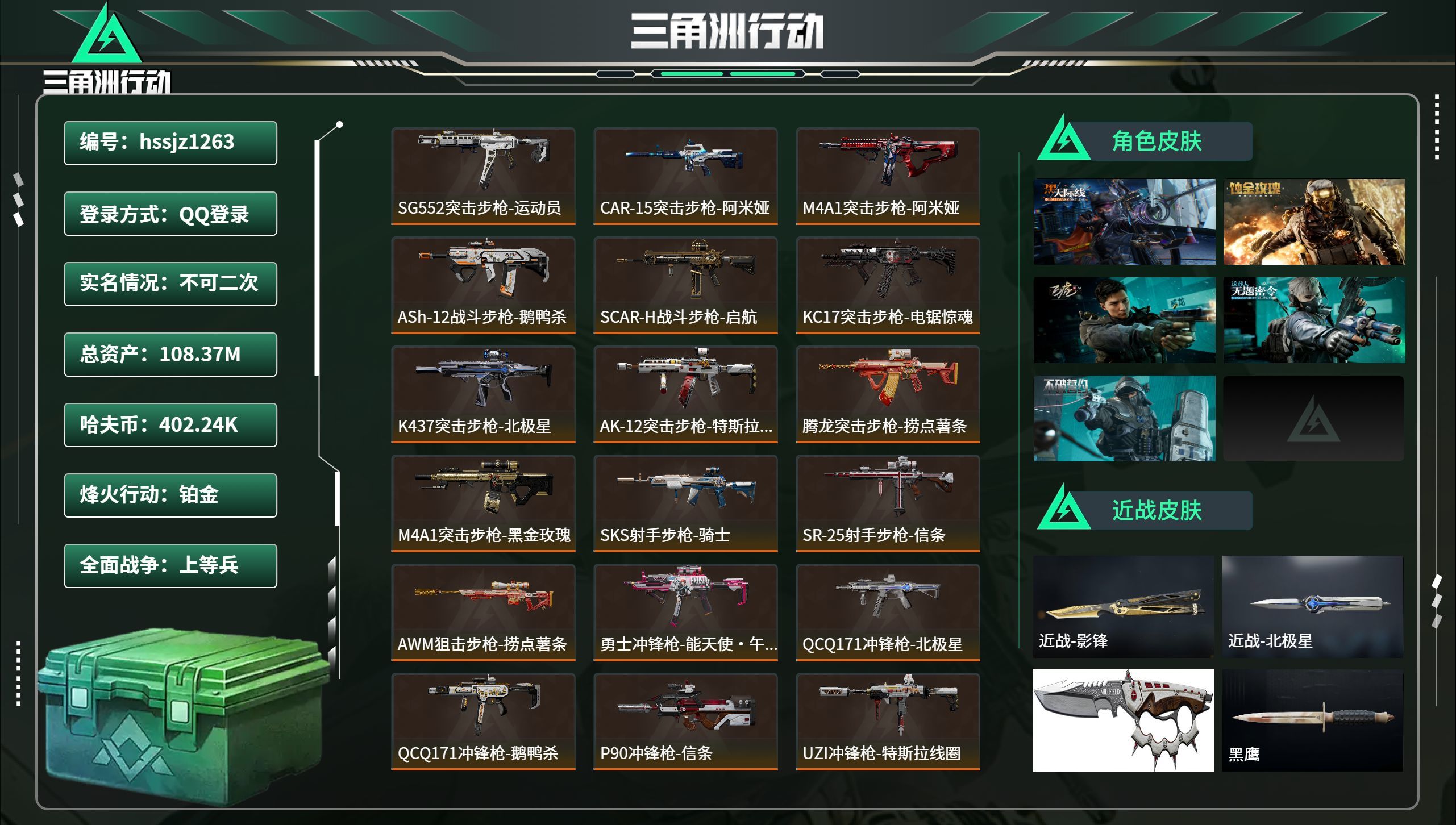 hssjz1263 总资产108.37M,哈夫币 402.24K,战场等级:35 上等兵,行动等级:
