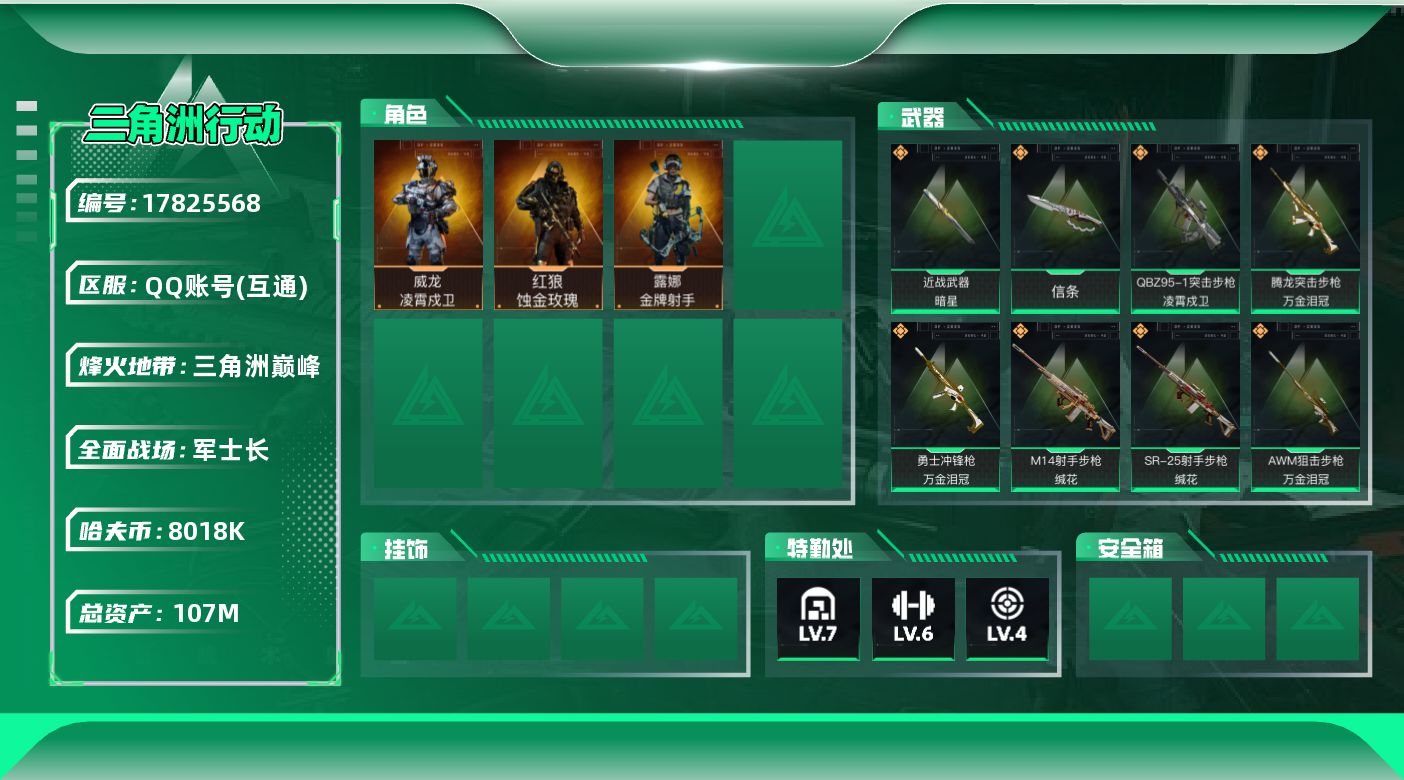 107m总资产-8018k哈夫币-60烽火等级-三角洲巅峰-20战场等级