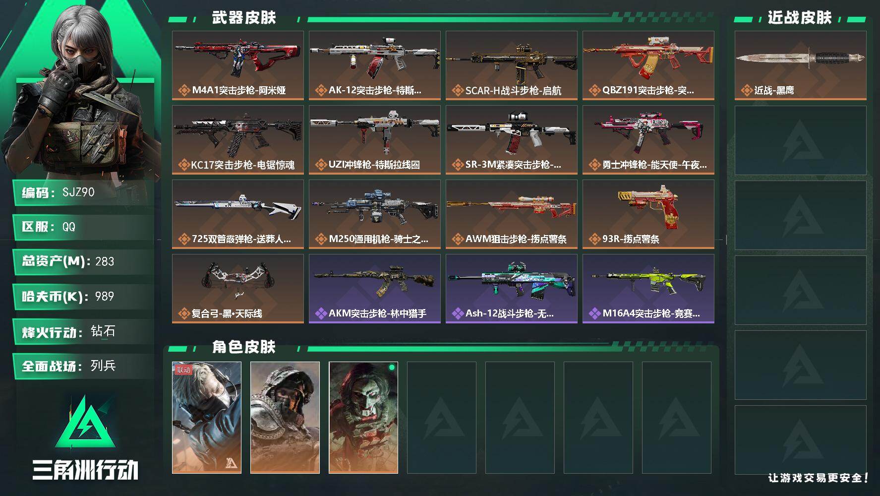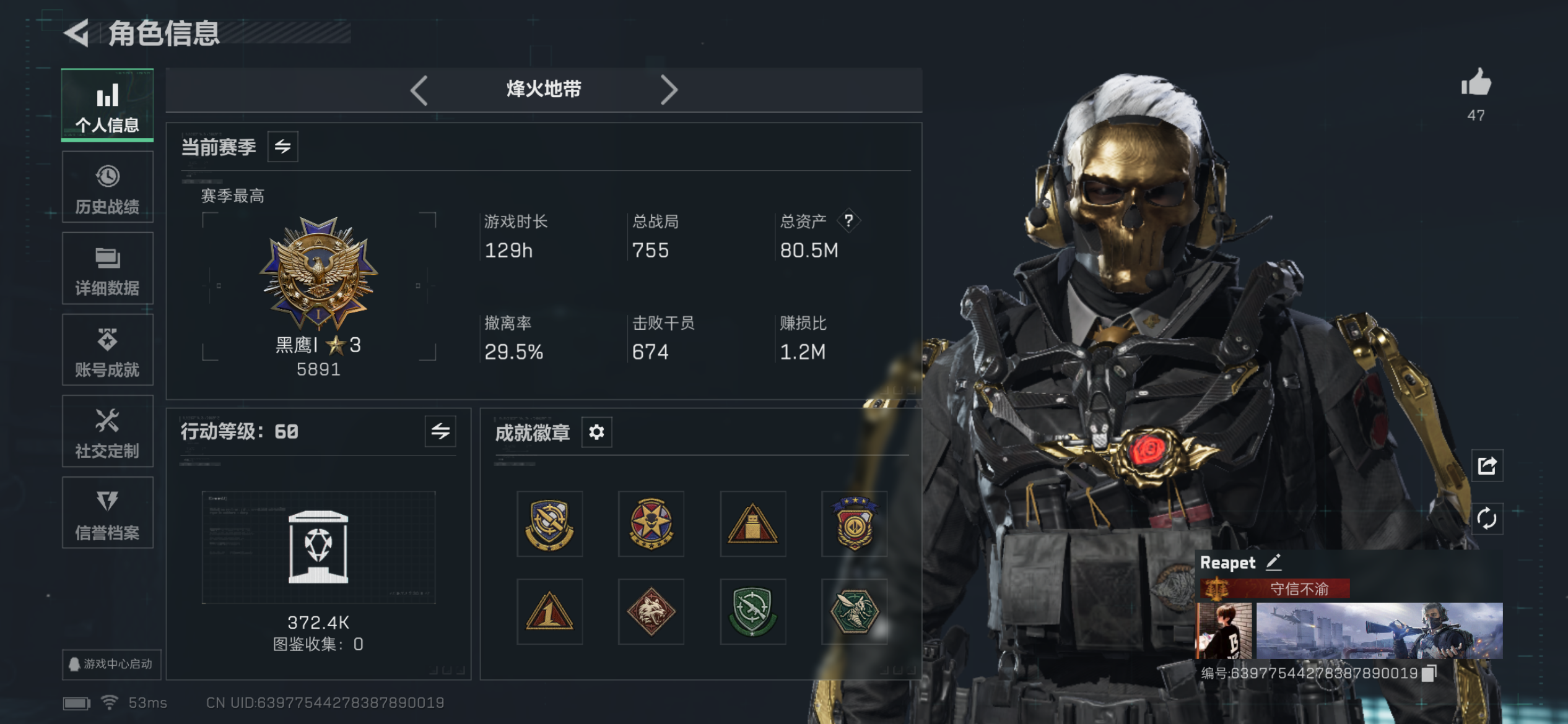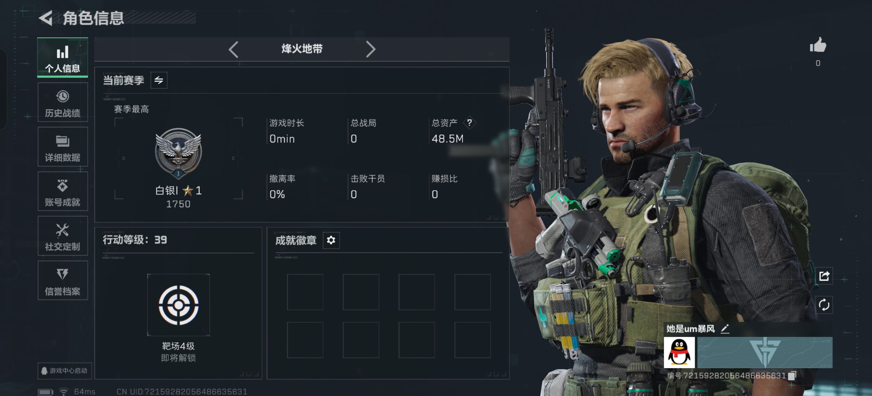 283m总资产-989k哈伏币-60烽火等级-钻石-10战场等级-列兵【干员