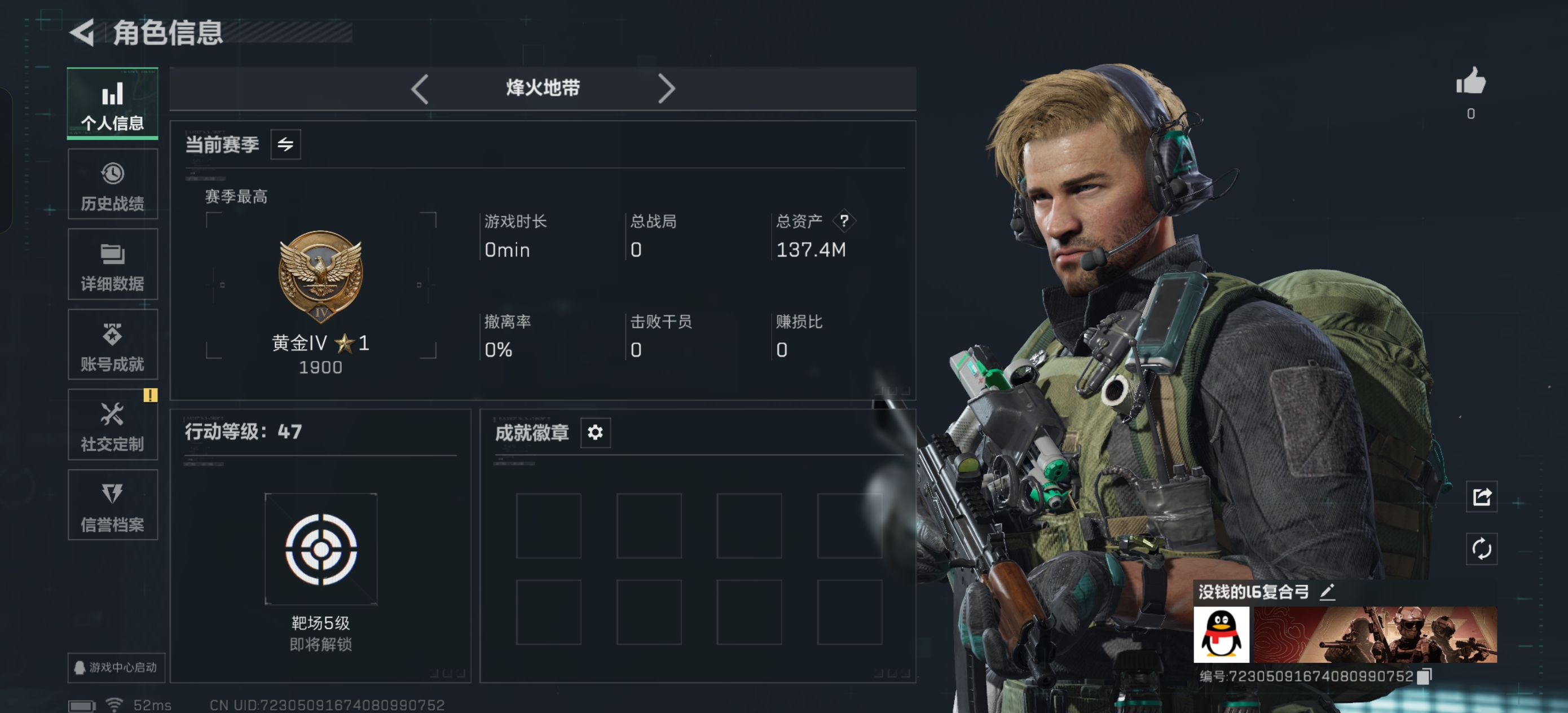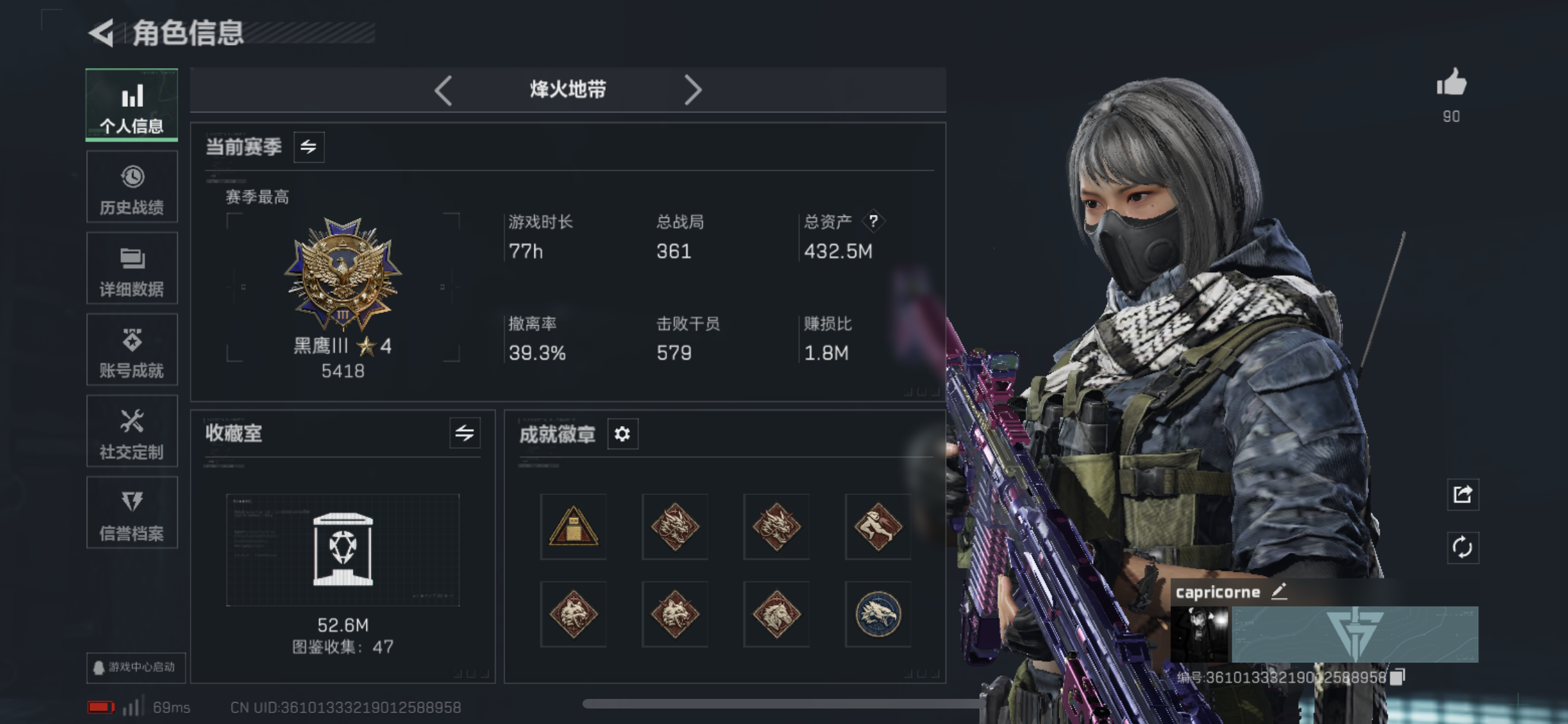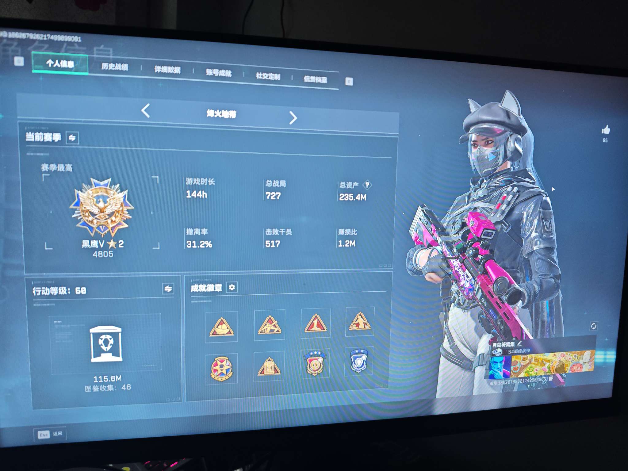 总资产(M):134M/哈夫币(K):8938K/传说枪皮数:23/全面战场等级:24_段位:列兵/烽火地带等级:60_段位:黑鹰/