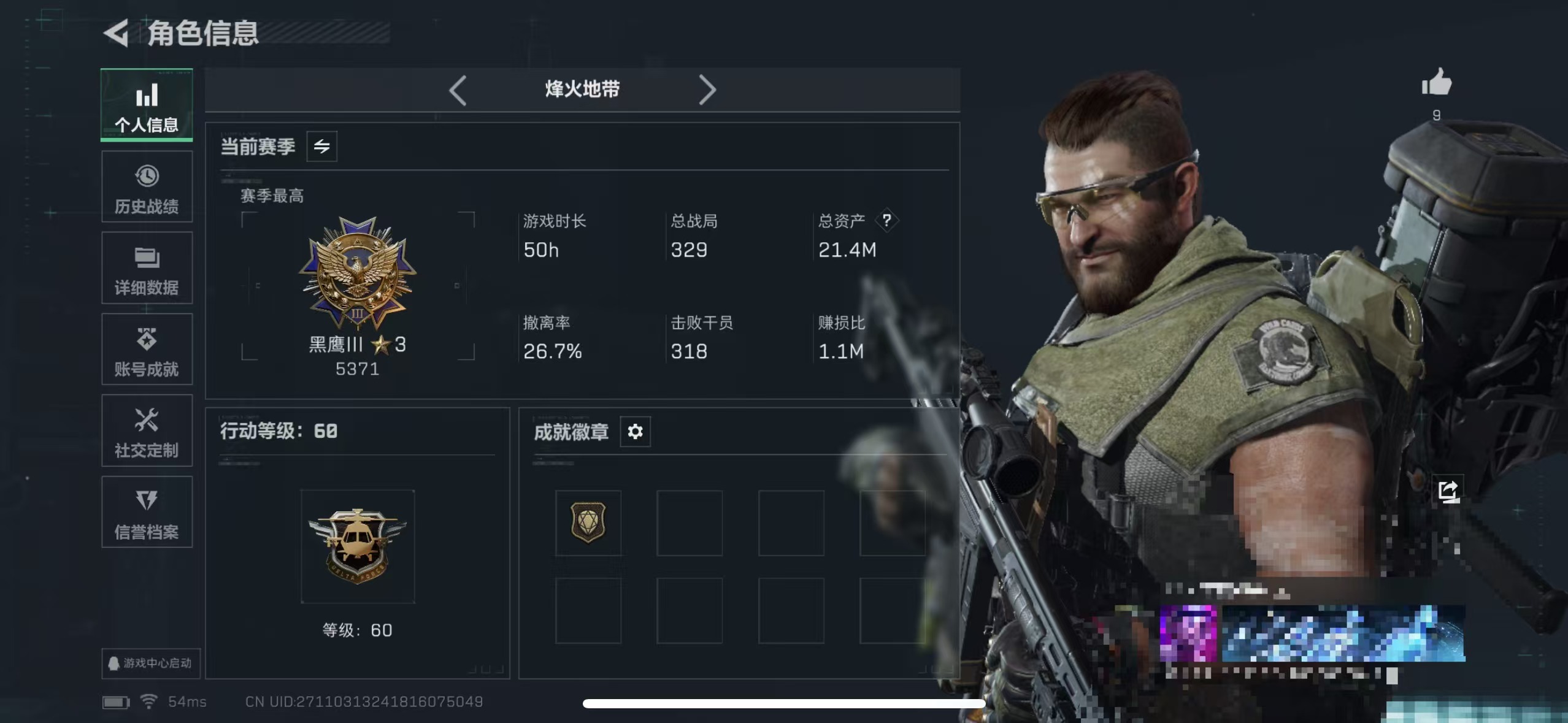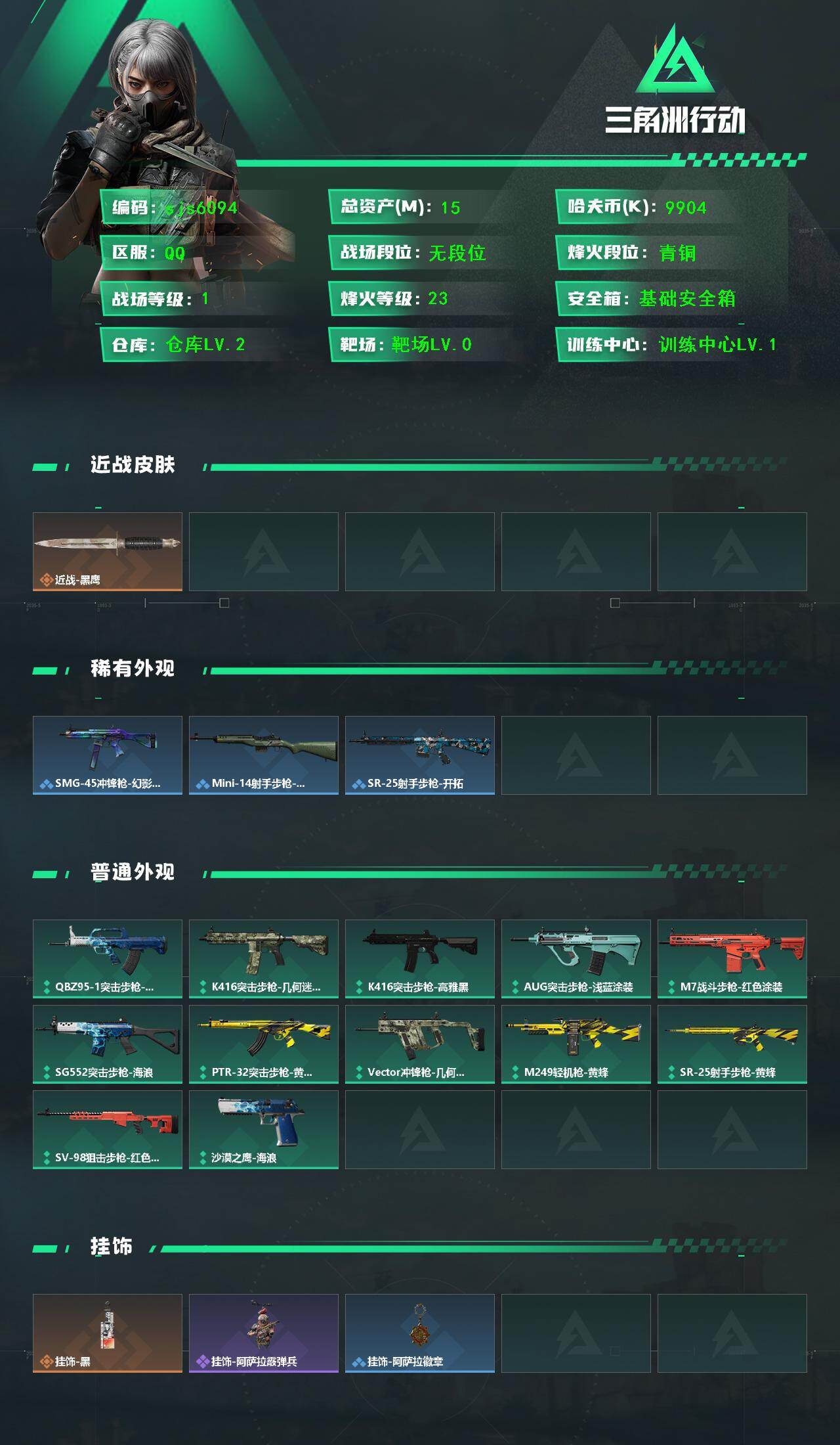 精品小号 烽火地带段位: 青铜 全面战场段位: 无段位 总资产: 15000000 哈夫币: 9904000