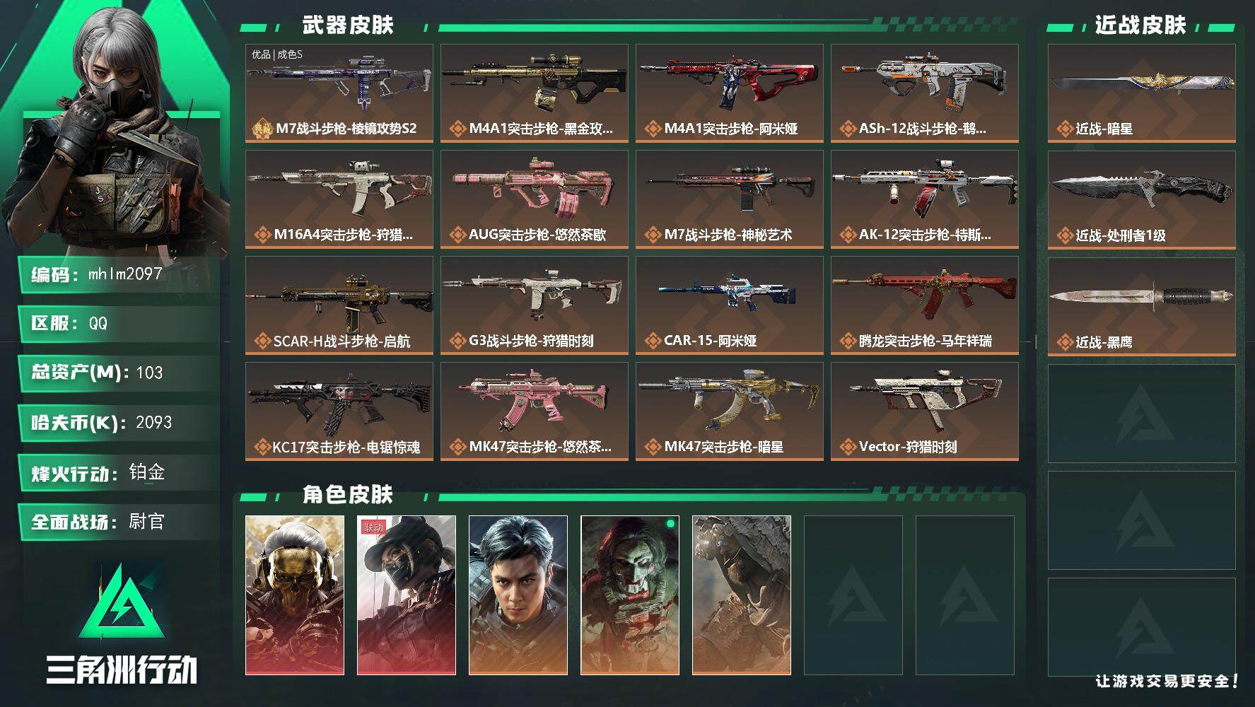 【mhlm2097】103m总资产-2093k哈夫币-60烽火等级-铂金-50