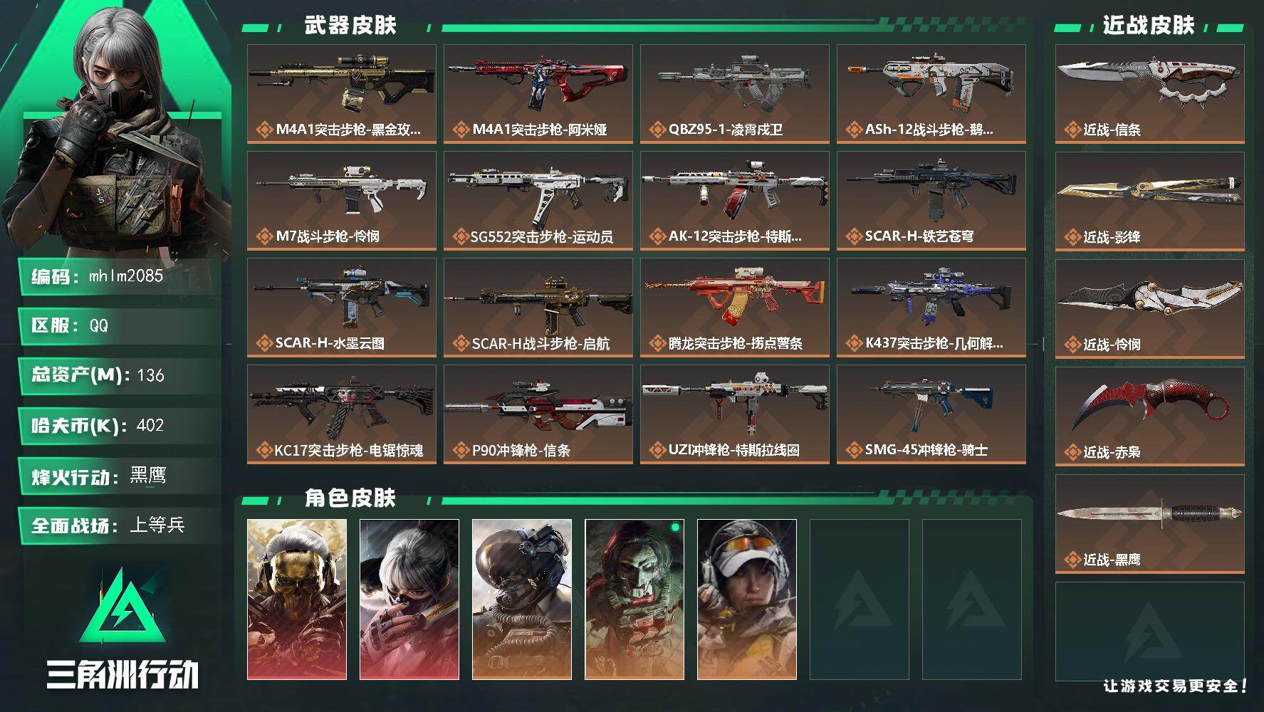 【mhlm2085】136m总资产-402k哈夫币-60烽火等级-黑鹰-50战