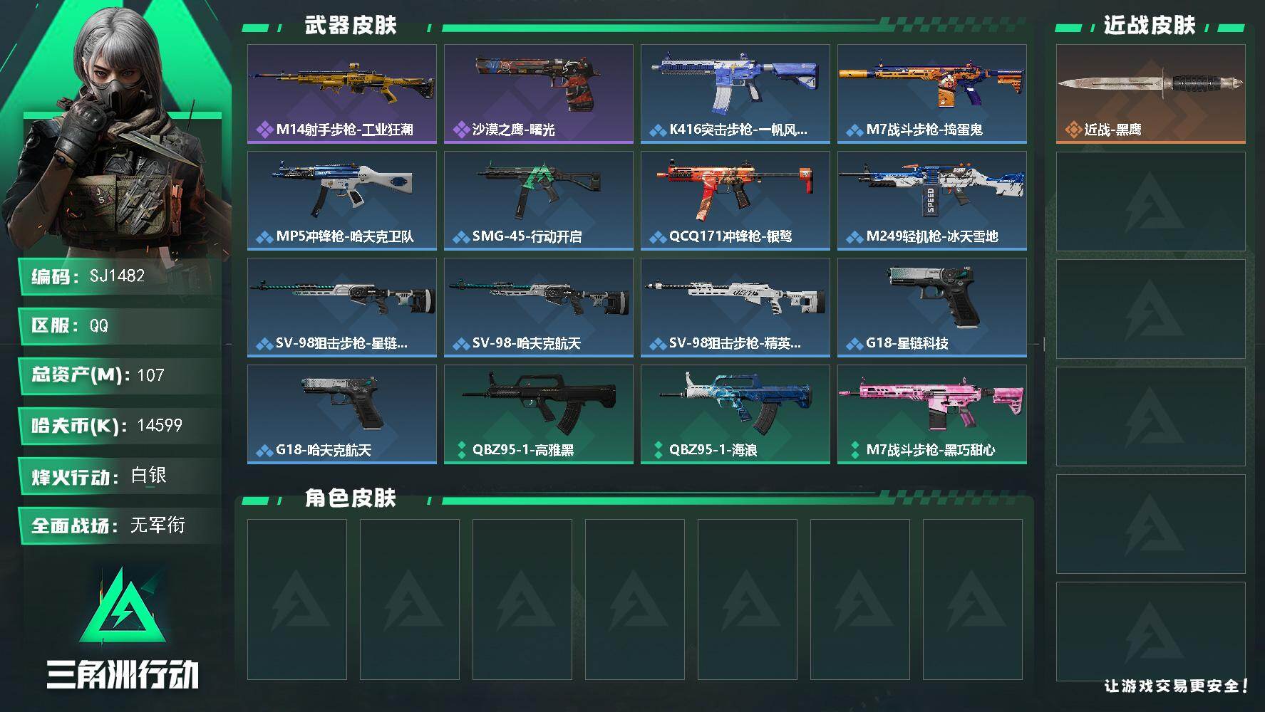 【SJ1482】107m总资产-14599k哈夫币-60烽火等级-白银-1战场