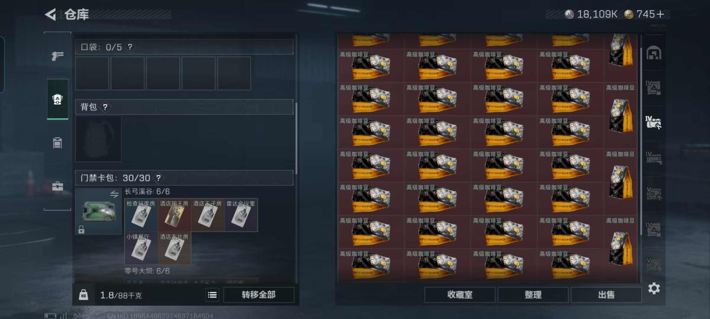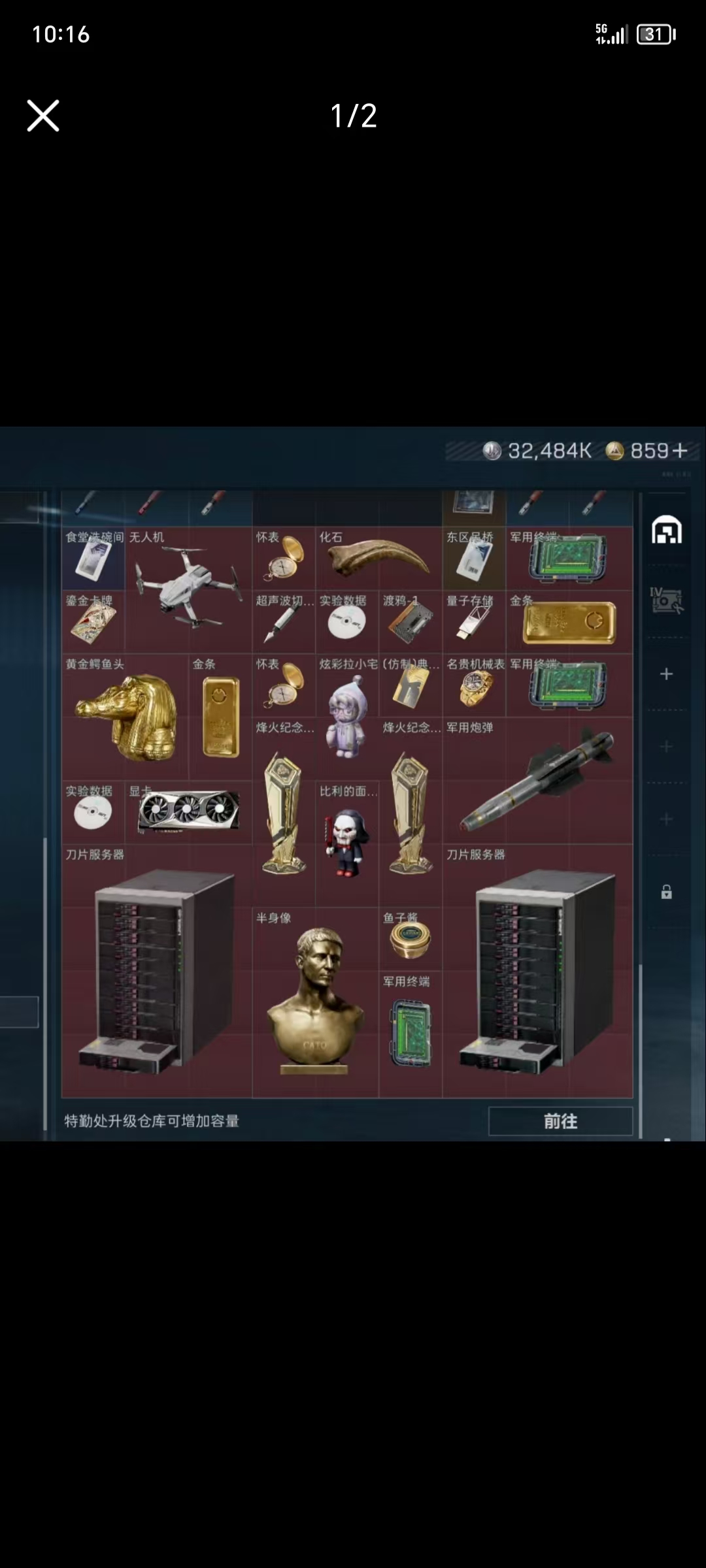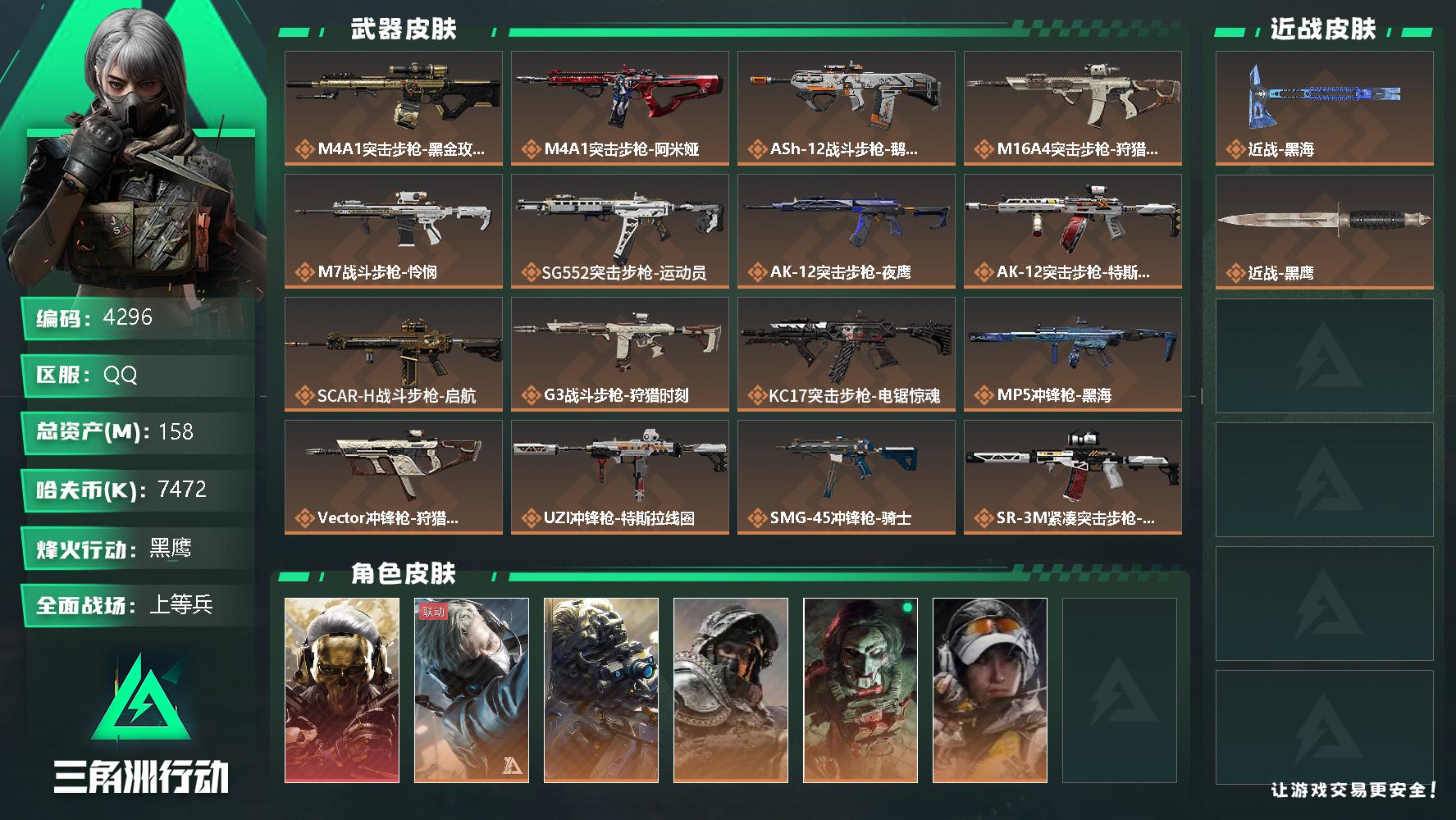 总资产158.7m 流动资产112.1M哈夫币7472k 1红皮 1刀皮 顶级安全箱 仓库lv9 训