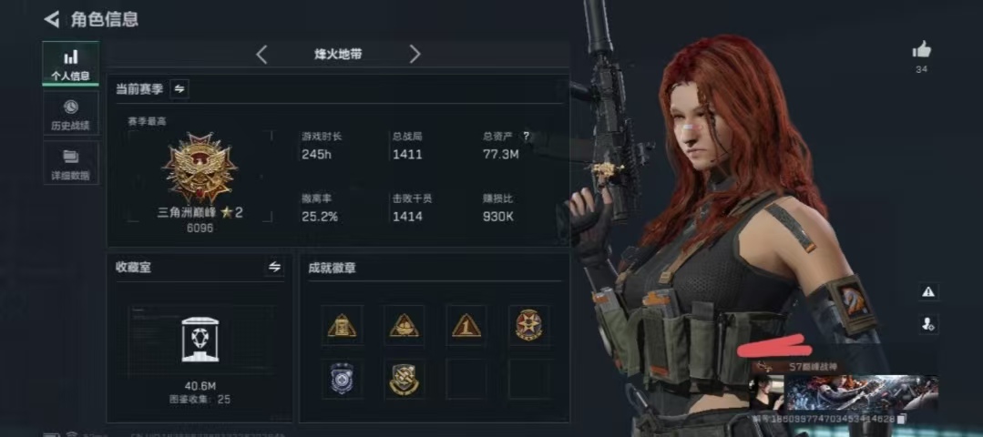总资产(M):103M/哈夫币(K):10860K/传说枪皮数:26/全面战场等级:50_段位:军士长/烽火地带等级:60_段位:黑鹰/