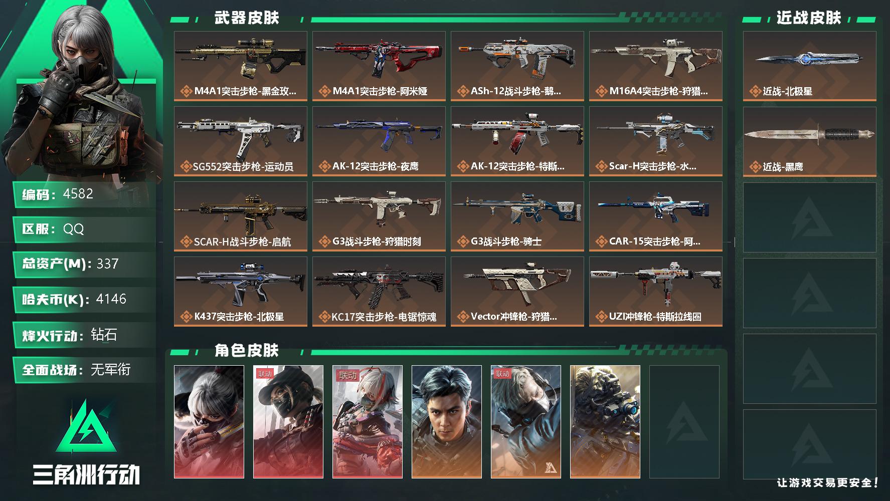 总资产337.6m 流动资产239.9m 哈夫币4146k 1刀 3红皮 6金皮 顶级安全箱 仓库l