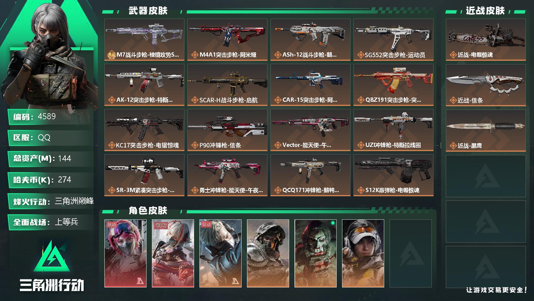 总资产144m 流动资产117m 哈夫币274k 2近战皮 6干员皮 1典藏枪皮 优品cM7战斗步枪