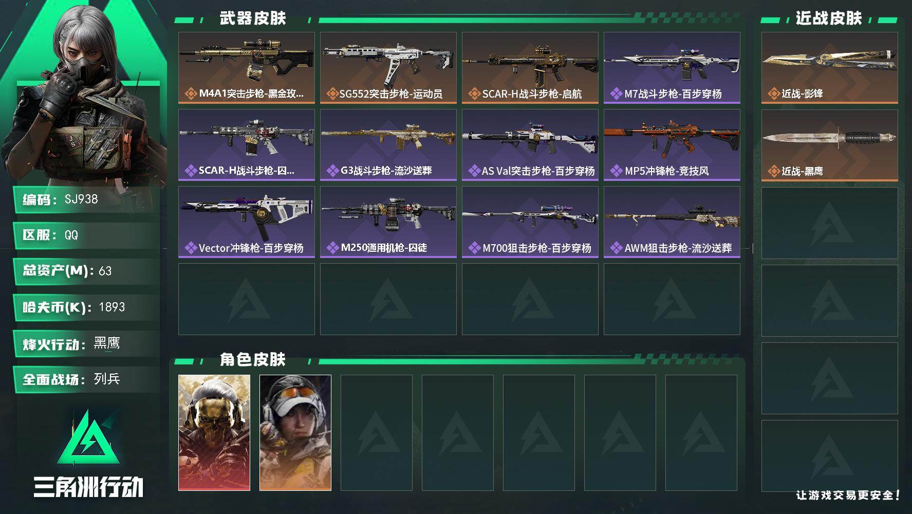 【SJ938】行动等级:60 总资产:63M 哈夫币:189.4W 近战武器: