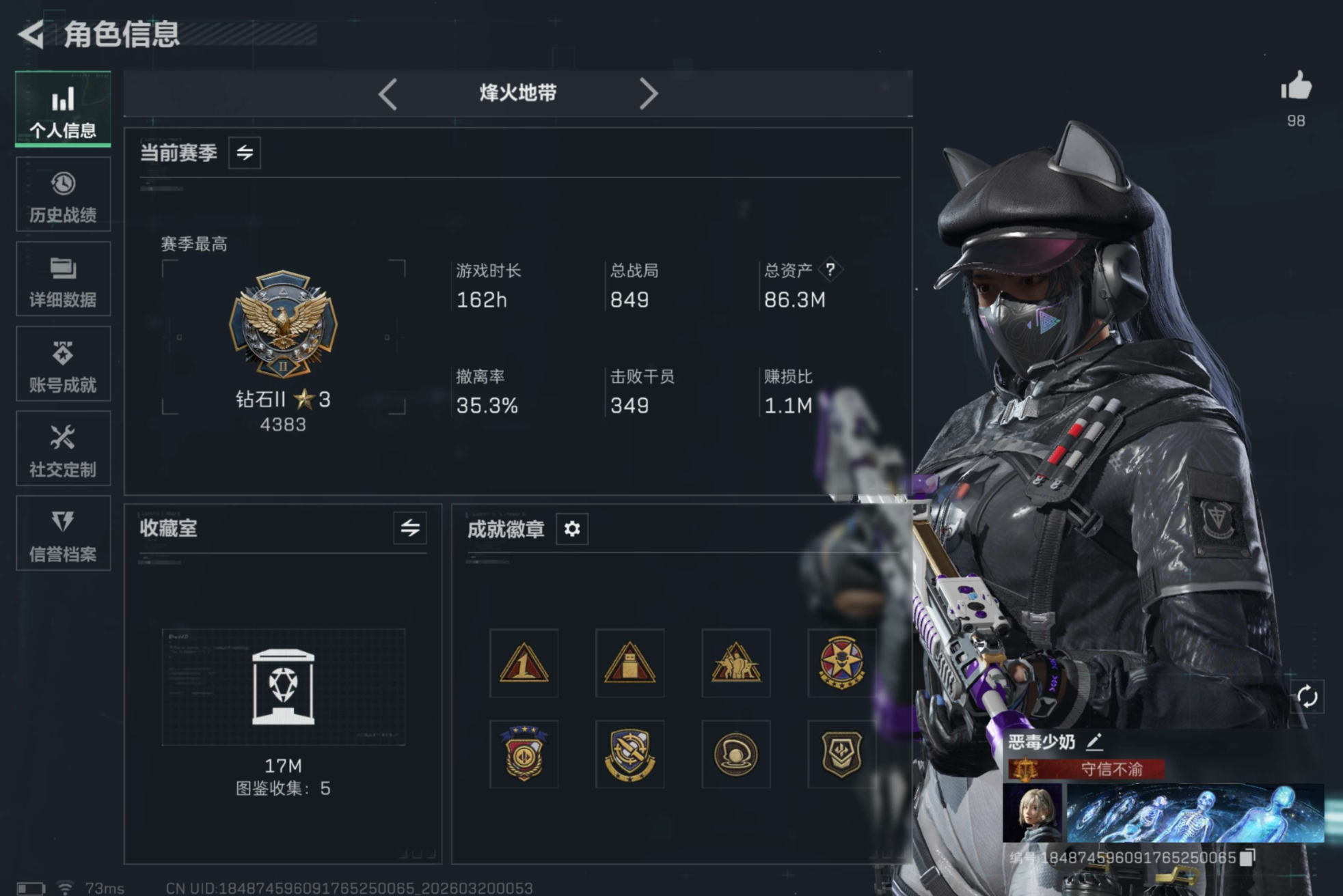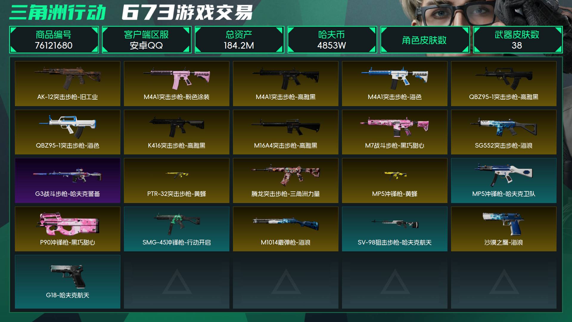 烽火段位黄金1 战场段位暂无段位 总资产184.2M 哈夫币4853W 挂饰9 近战2 枪械38 载具2