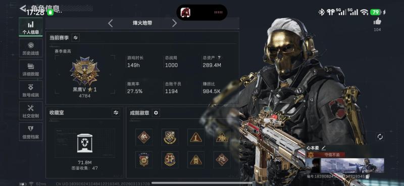 总资产:122.2M,哈夫币:9289W,武器皮肤29,烽火50级:铂金