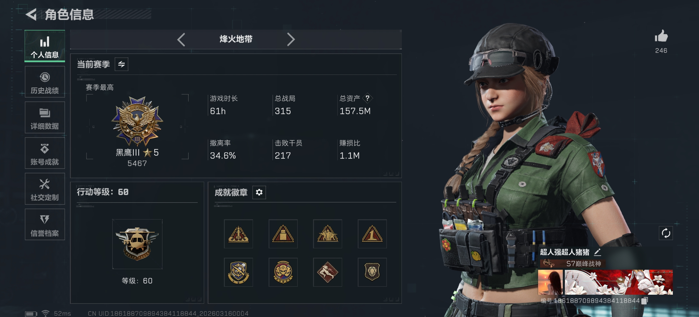 87m总资产-3016k哈夫币-60烽火等级-钻石-12战场等级-列兵【干员