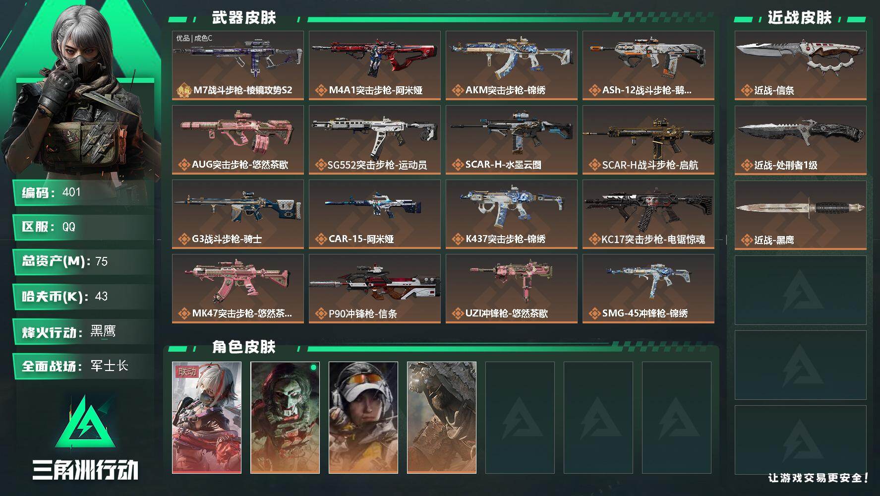 75m总资产-43k哈夫币-60烽火等级-黑鹰-26战场等级-军士长 点卷14
