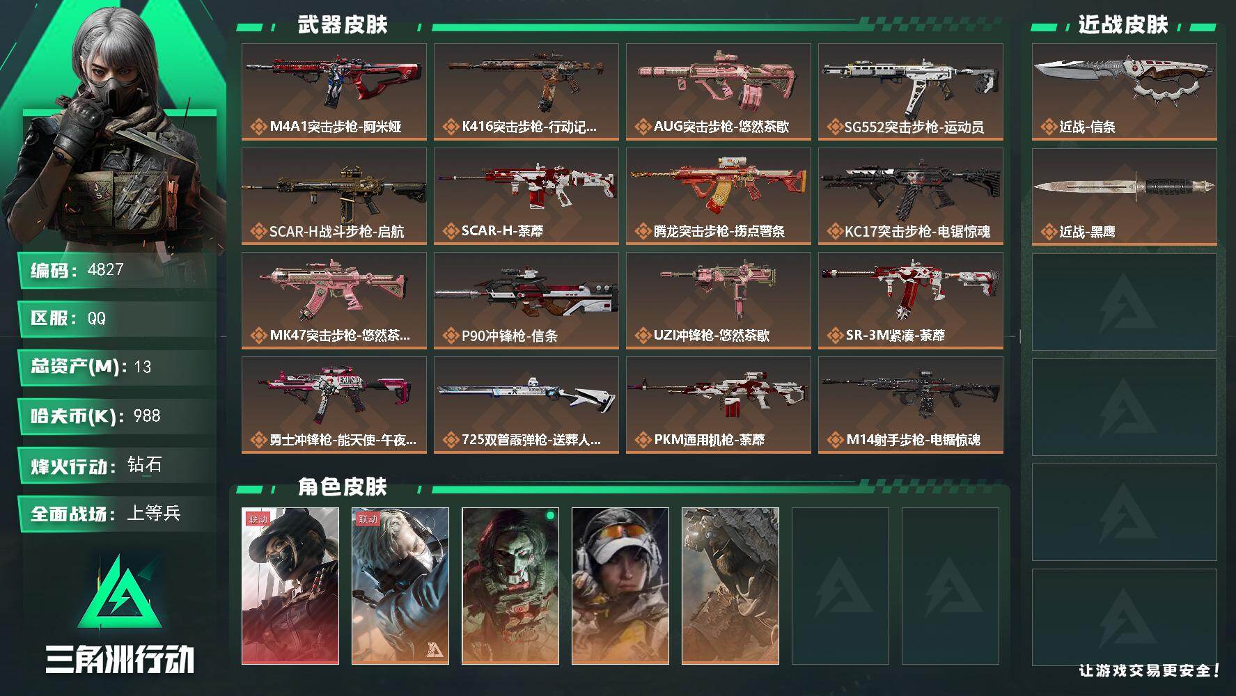 13m总资产-988k哈夫币-60烽火等级-钻石-21战场等级-上等兵【干员