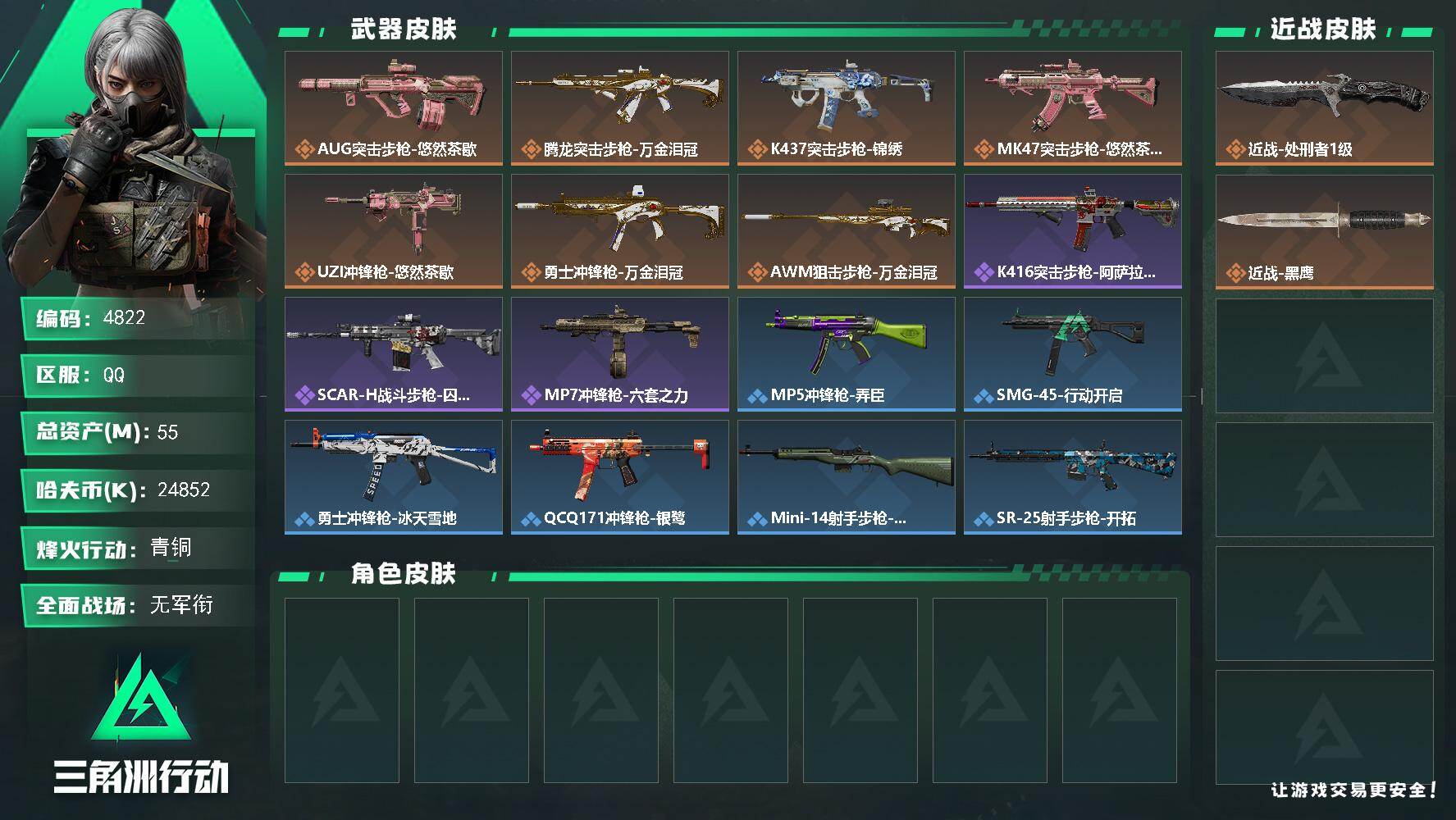 55m总资产-24852k哈夫币-36烽火等级-青铜-1战场等级-无军衔【近