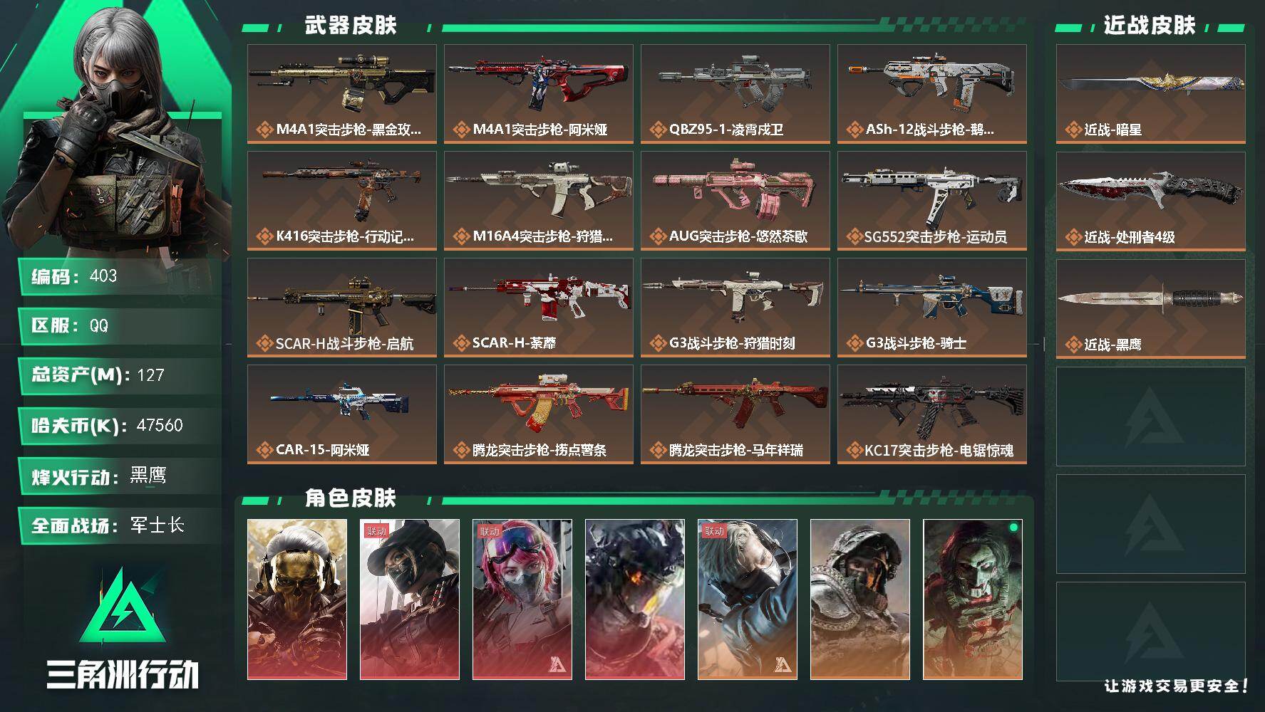 127m总资产-47560k哈夫币-60烽火等级-黑鹰-27战场等级-军士长w